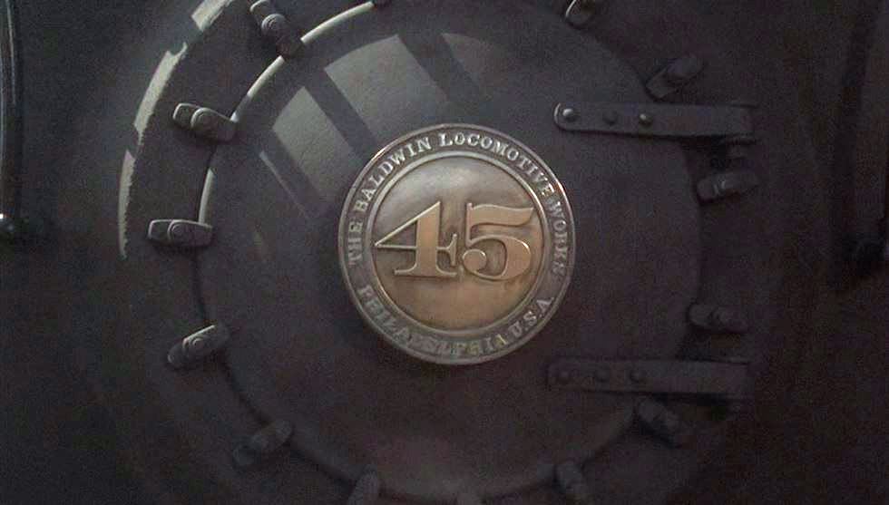 Finale. Closeup of Baldwin builder’s plate on the front of the CW #45. At the Fort Bragg depot (renamed “Point Muir” for filming), two small boys chat with the engineer.