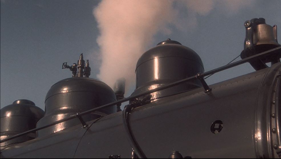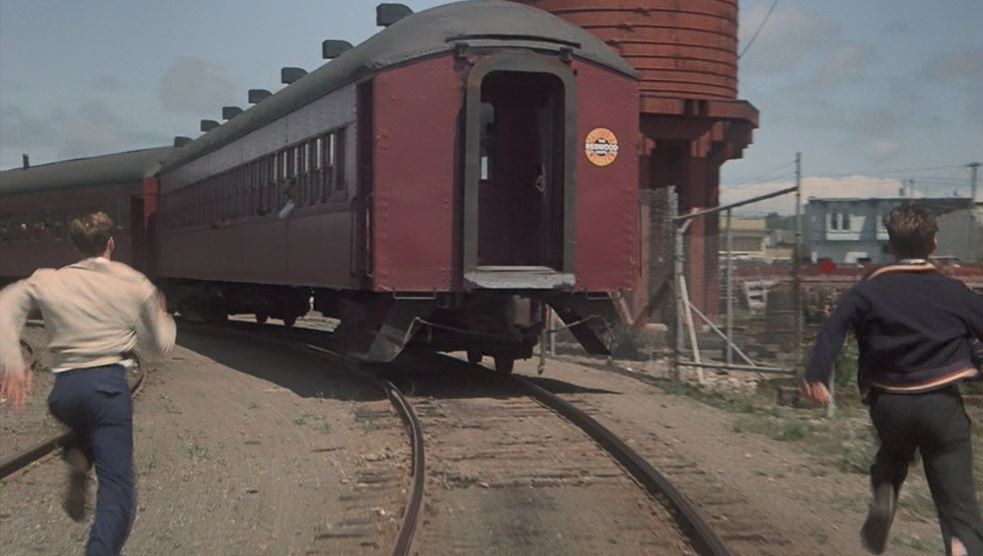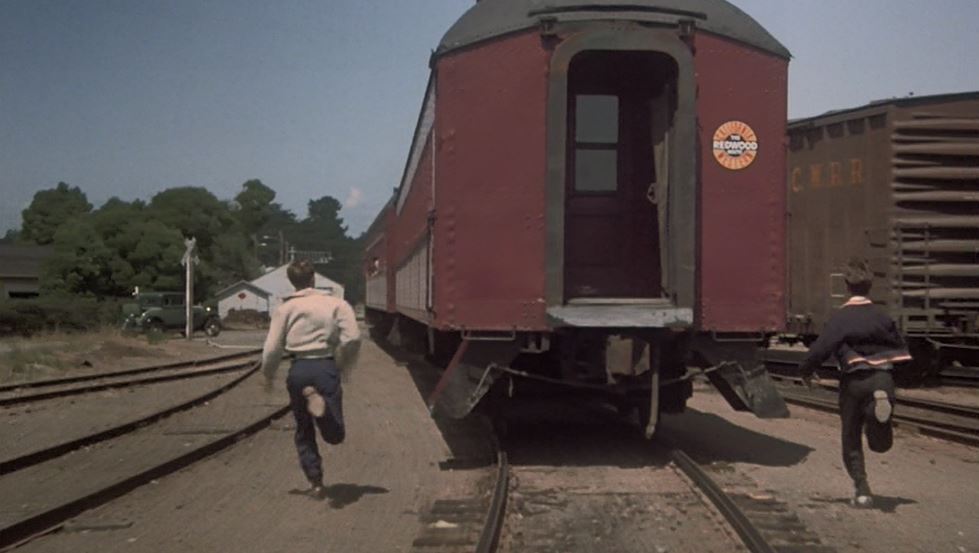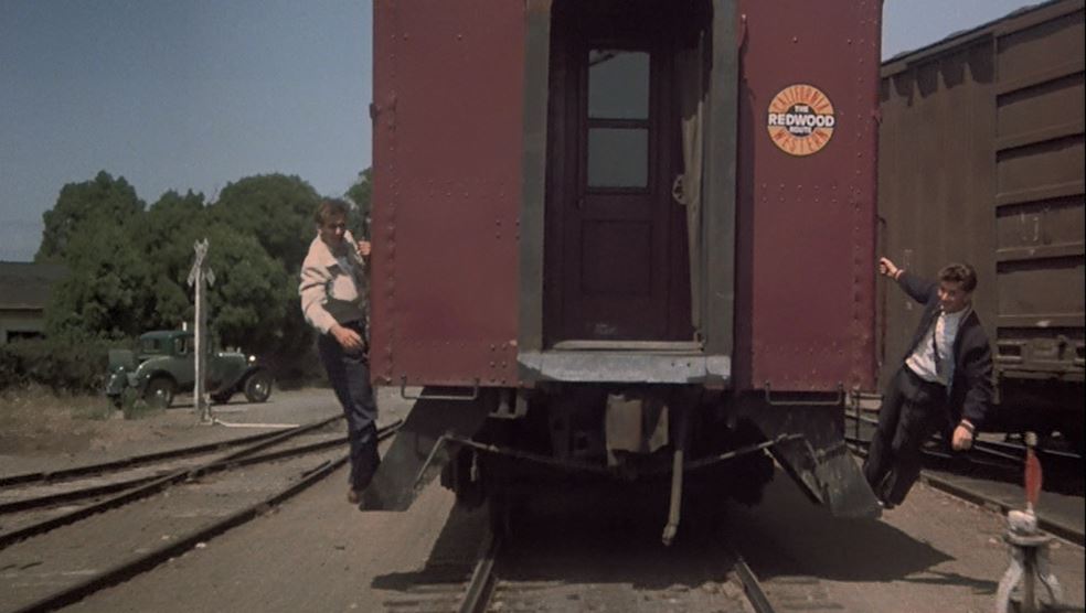Which is exactly what they do. Note the “California Western – The Redwood Route” sticker pasted on the rear car. The lads are hanging on the side steps as the credits roll.
