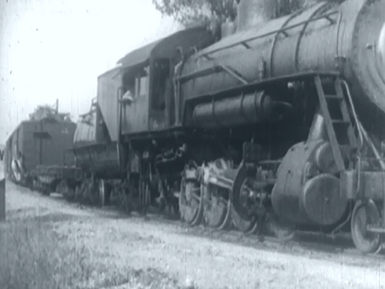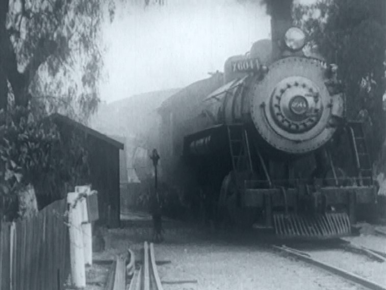 Union Pacific X6044 rounds the corner passing the Webb family homestead. The 2-8-0 was built by Baldwin in February 1907. Helen’s Dad, Tim Webb (played by Andrew Waldron) climbs the locomotive’s steps and waves goodbye to his daughter. Good views of a high switch lantern and some ancient wooden box cars as the train leaves town.