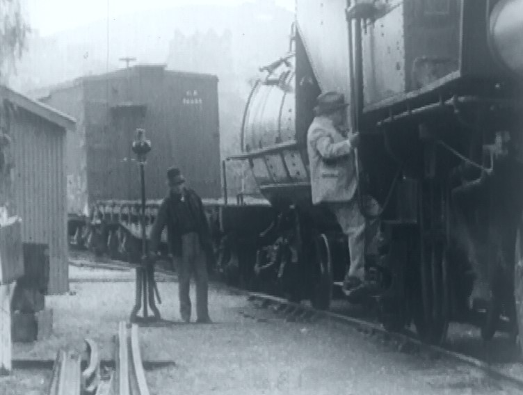 Helen is getting mighty chummy with John (who helped her out of an earlier scrape) MUCH to the displeasure of Master Mechanic Jim Haggerty BOOO!! (played by Arthur Morrison) who also has eyes for Helen. In the second view (behind Jim) is a different vista of the roundhouse including #2106, a little 0-6-0 switcher with slope-back tender.