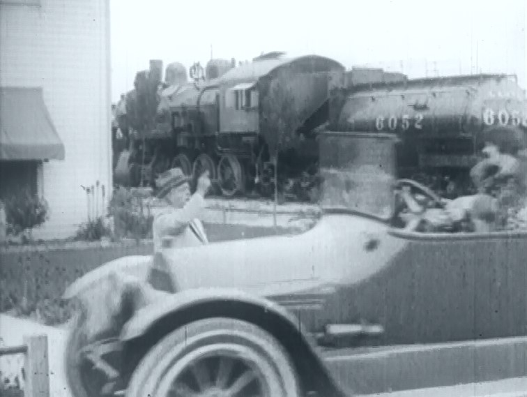 Two good shots of Helen driving her flivver. First, we get a view of the UP roundhouse and turntable with a nice assortment of steam locomotives; Second, Helen visits Dad (Tim Webb, the Division Superintendent) at headquarters. That’s LA&SL #6052 beside the building (Baldwin built October 1907 2-8-0).