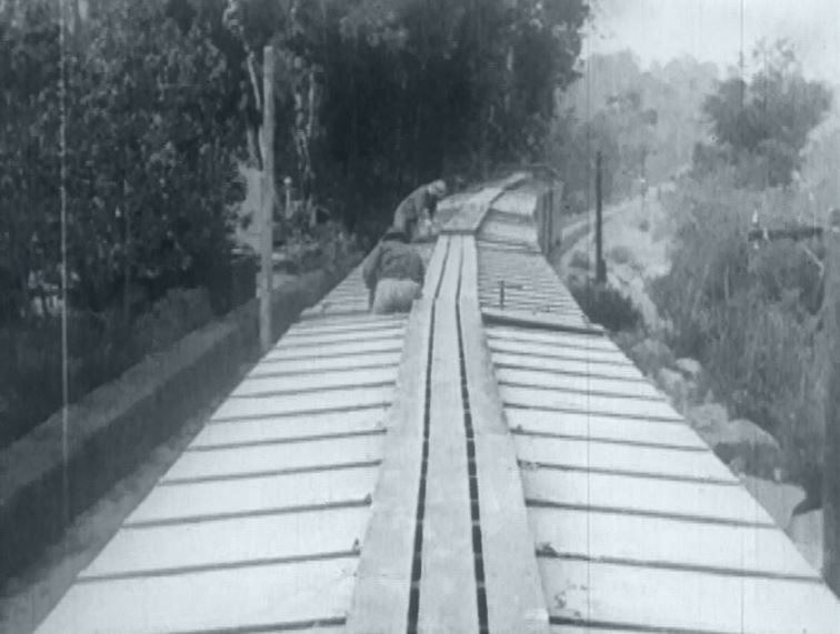 Rounding a curve, John (to his horror), comes upon a little girl trying to free her dog from a trestle. That’s Helen trying to get the kid off the bridge.