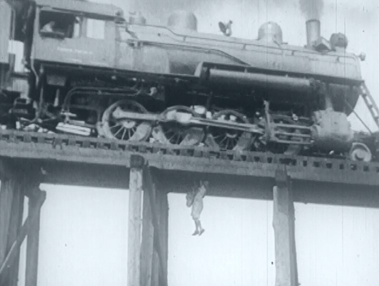 Helen to the rescue! Hanging onto a bridge tie, she dangles precariously as the entire train passes overhead.