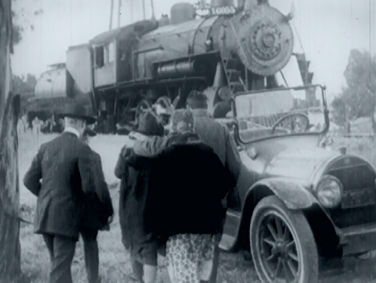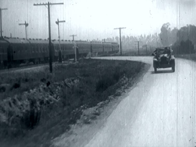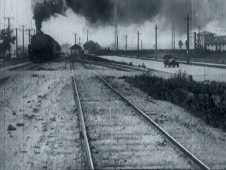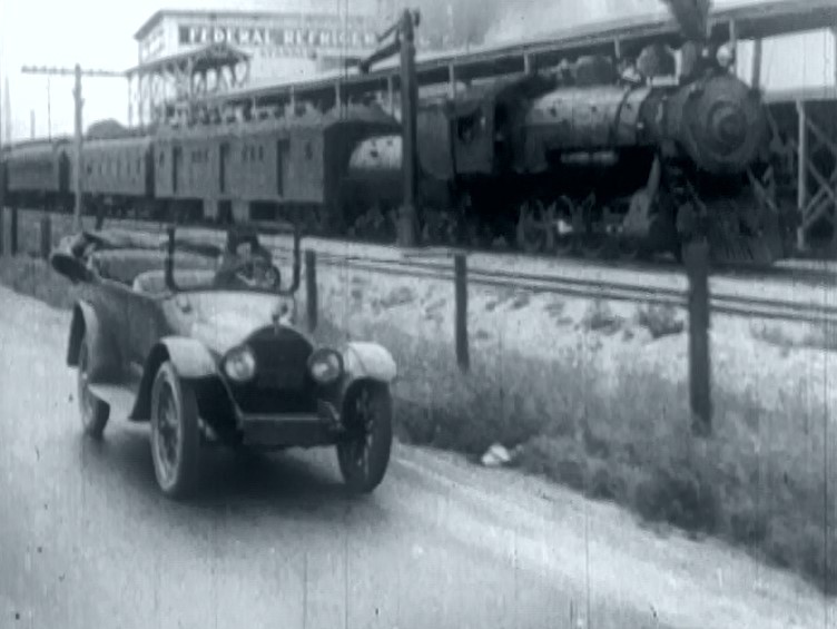 Pulling alongside, Helen is overtaking the train. Is that an odd-looking 3 door baggage car, or what?; Oochie Wig-Wag crossing signal. Stop! Look out!; Whoa! Thill-seeker Helen JUST misses getting T-boned by the onrushing express. Safety Last.