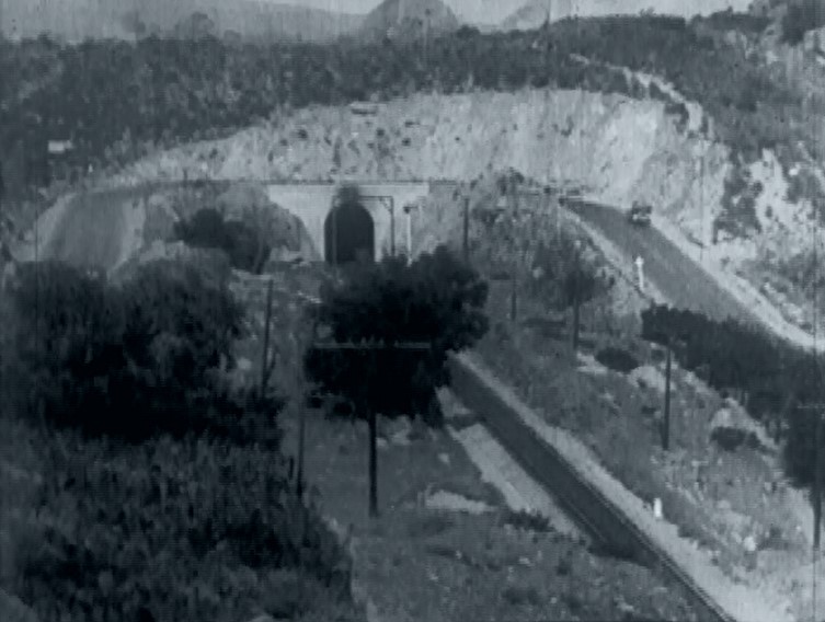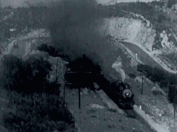 I would love to know where this location is (maybe it has since been daylighted), where the road crosses a tunnel portal on a horseshoe curve. You can just make out Helen in her car chasing the train.