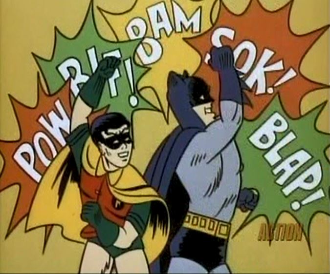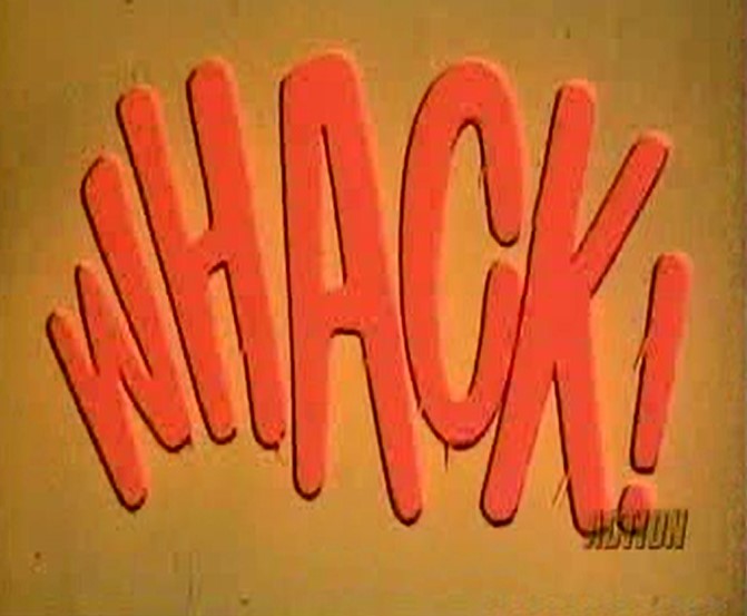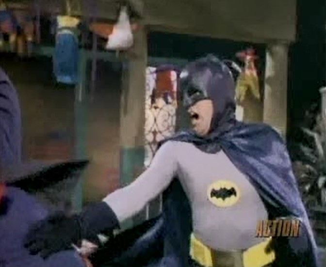 Pow! Every episode seemed to feature a fight scene. All actors involved made sure to ham it up to the max. In this one, Batman does some great Judo chops, whist Robin and Batgirl rely on flying leg kicks.
