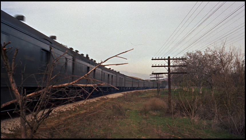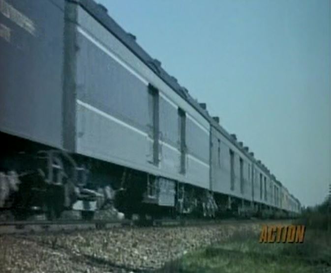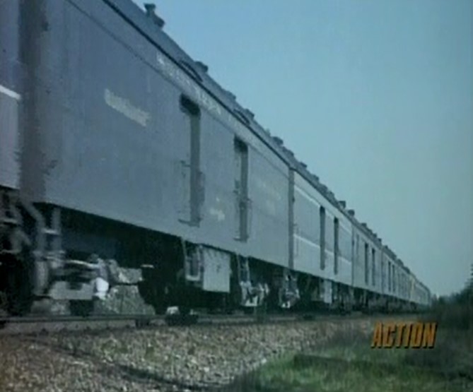 The only actual railroad scene (from archival footage) is this brief clip of a Southern Pacific mail, express, and passenger train seen here. More details about this clip later on, including a guess as to which train it might actually be.