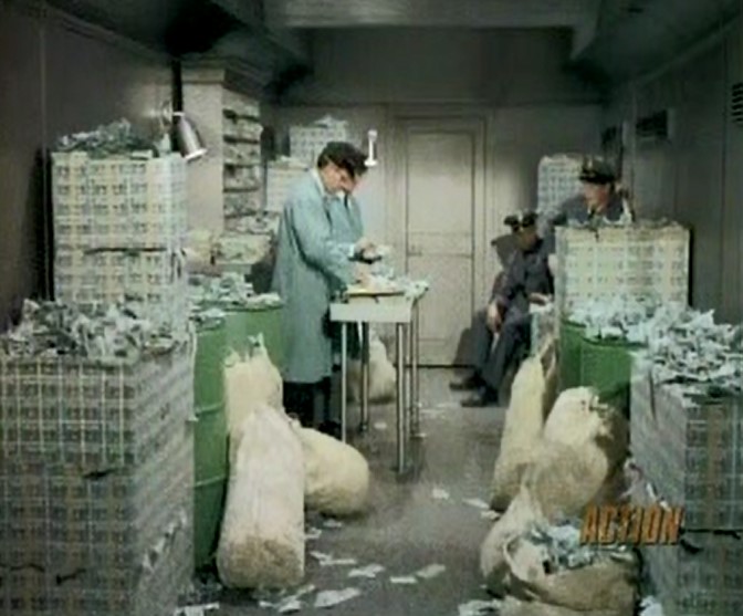 Okay. Enough self-indulgence. On with the train scenes. Batman has learned that Shame (played by Cliff Robertson) and his gang plan to hold up a train carrying “old money being sent to the Treasury Department to be destroyed”.