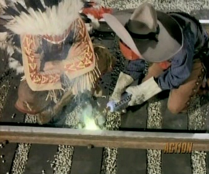 “Nothing to worry about. I make this same trip at the same time every month.” (The yawning guard is not impressed.) “You know, they’d have to sever the rails with an acetylene torch to even slow it down.” Of course, we then see Shane’s gang doing just that.
