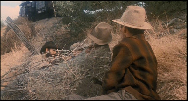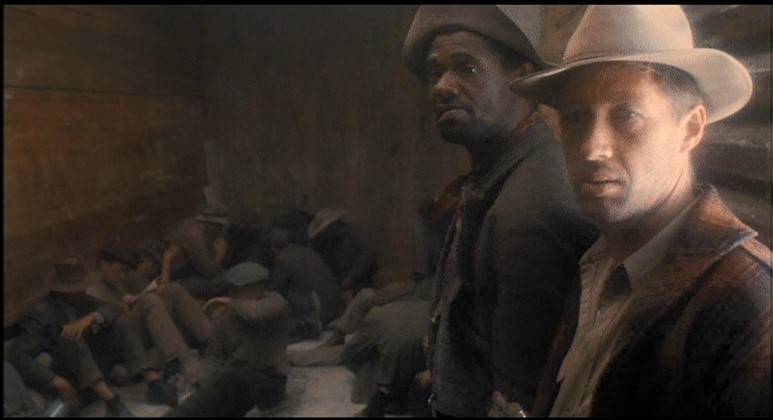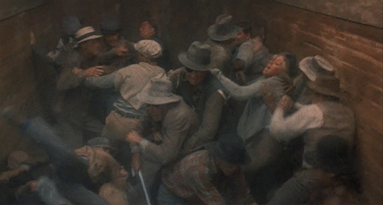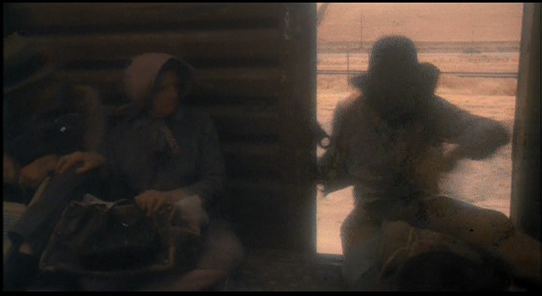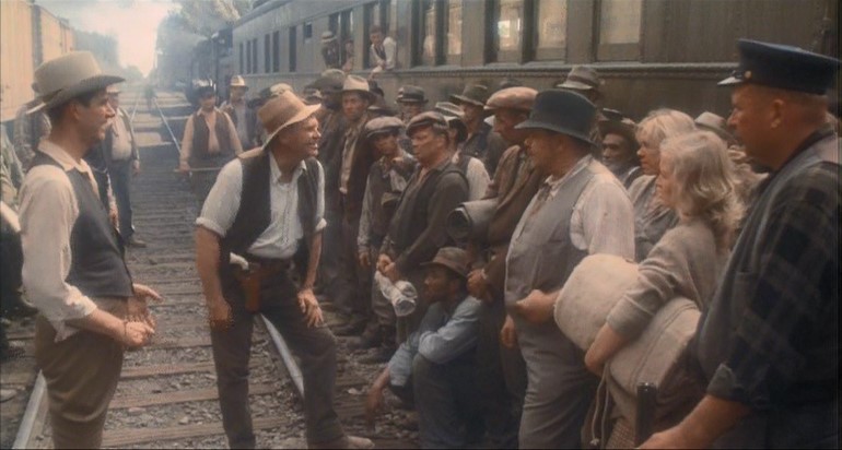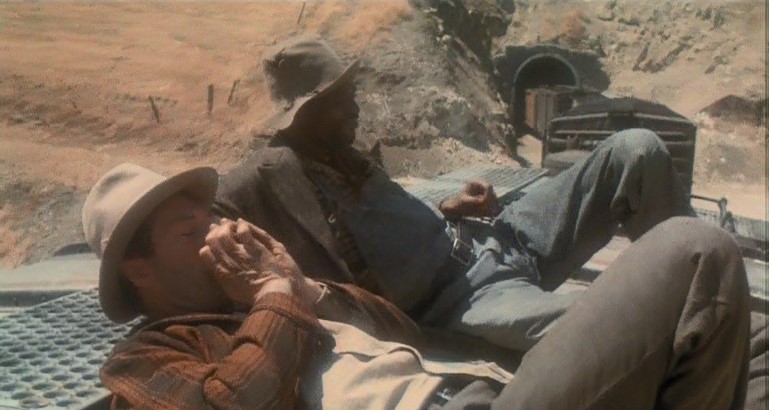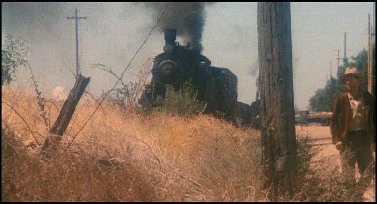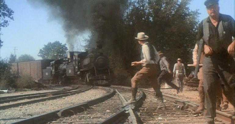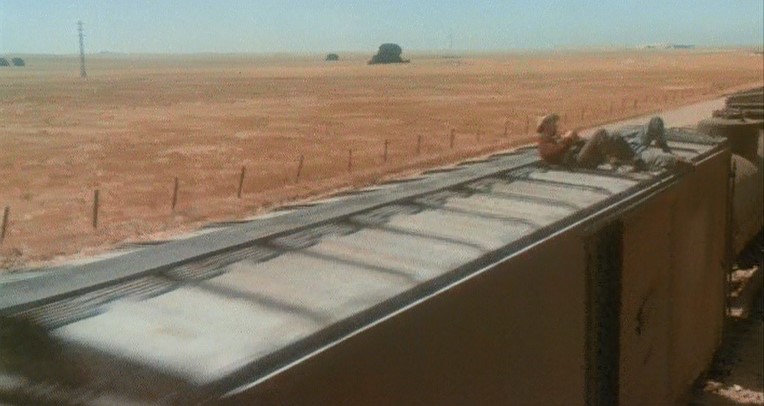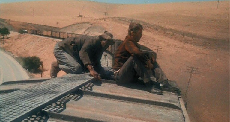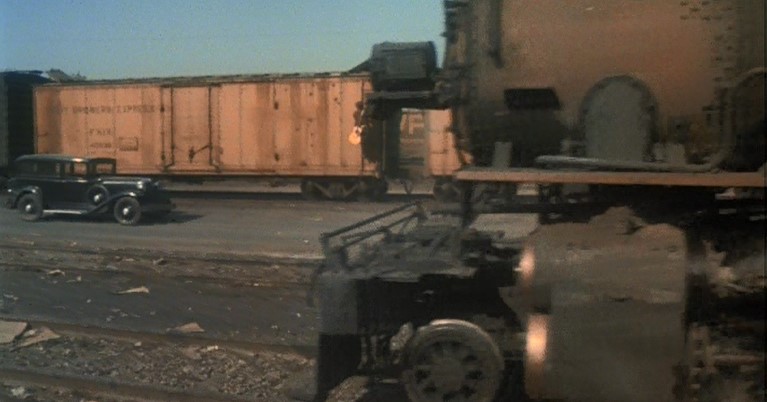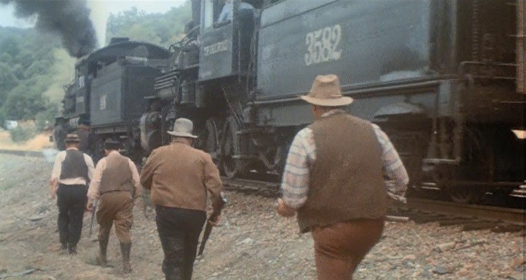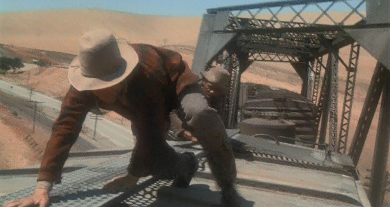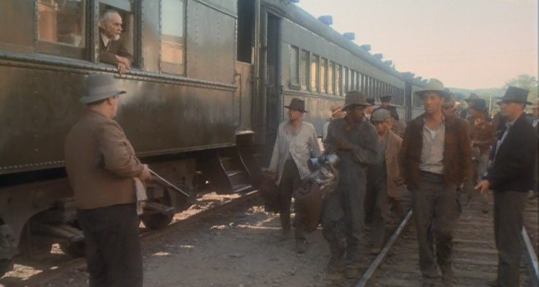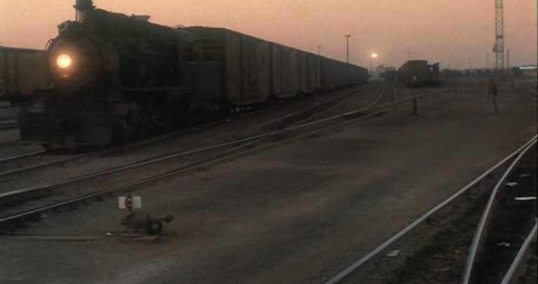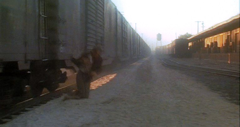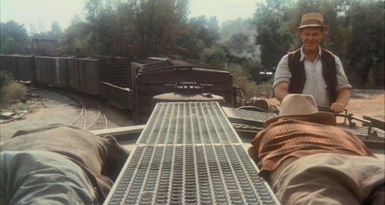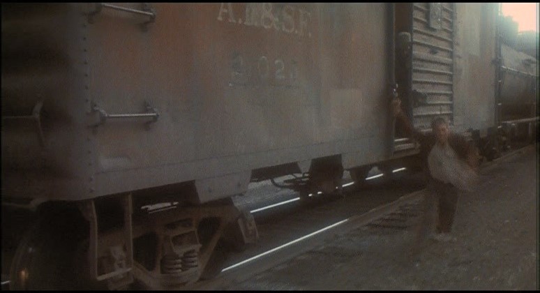 This being a gritty, epic, over-long (147 minutes) movie, a brawl starts amongst the hobos and Woody is consequently ejected from Santa Fe Railway (AT&SF) boxcar #2102. Great stunt, though.