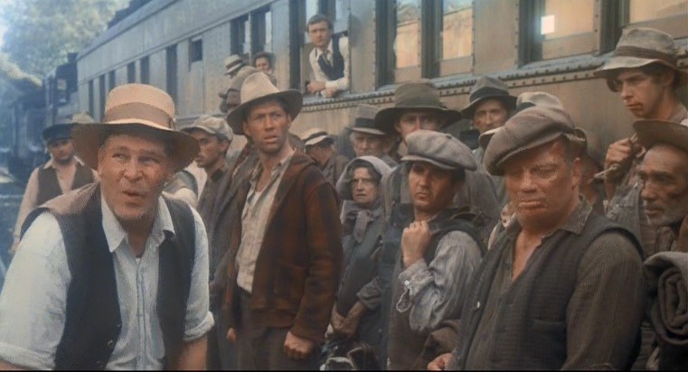 The hobos are told they can either pay for a ticket to ride the train out of town or be declared vagrants and jailed – OR – walk to the next town. Penniless Woody and others walk alongside the heavyweight cars as it pulls out. I love that silver step box in the rear vestibule of the last coach.