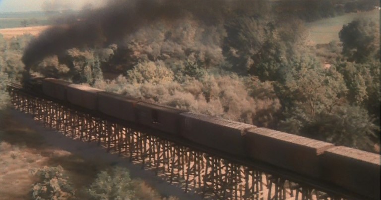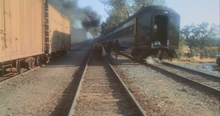 Passing shot of the two hobos riding the roof. In the second shot notice the smoke. Diesels actually pulled the 34 car train and filmmakers used the aforementioned smoke unit to simulate a steam engine.