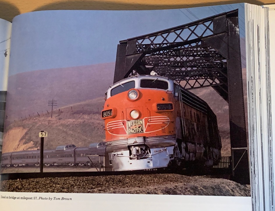 Running alongside, Woody manages to climb up on another boxcar as they roll through a tunnel. Oh, I know where this bridge picture is. From my book “Portrait of a Silver Lady” (Benson/MacGregor) Page 139, Photo by Tom Brown. That’s the WP’s California Zephyr running through the same bridge as a comparison.