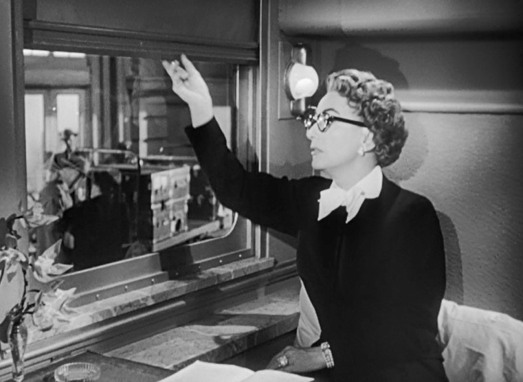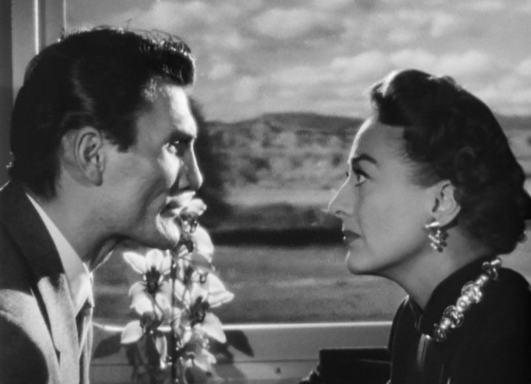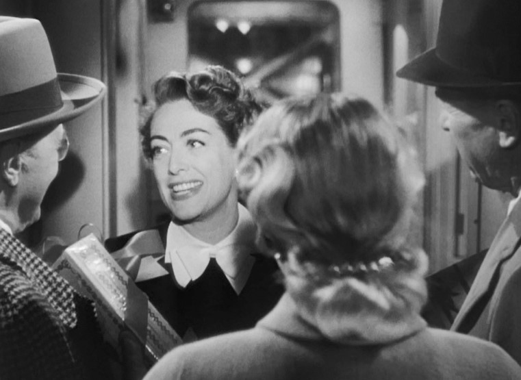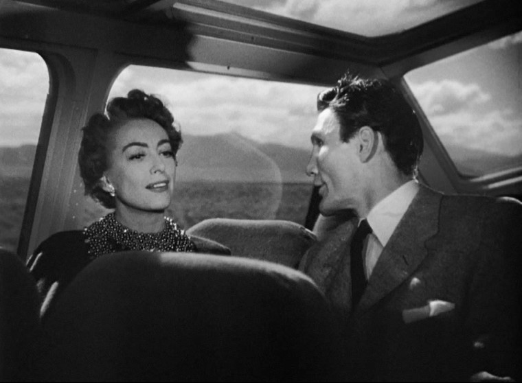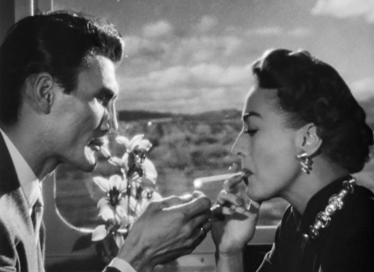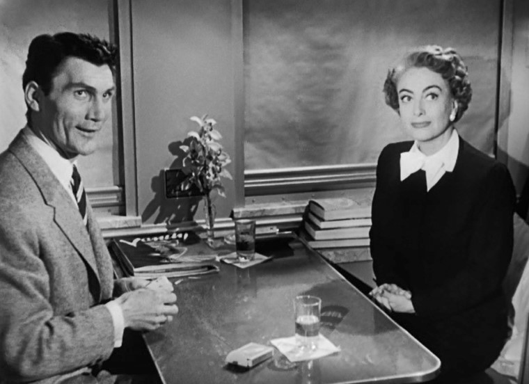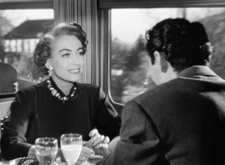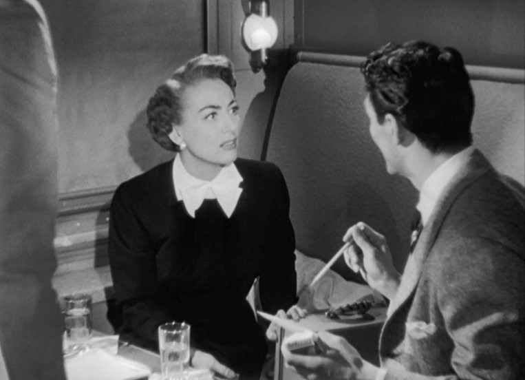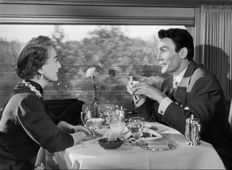 Myra Hudson (played by Joan Crawford) is a successful playwright whose smash hit is running on Broadway. Whilst riding the train out of New York, she spots Lester Blaine (played by Jack Palance) boarding at an intermediate stop. Myra had rather abruptly dismissed Lester from her play. Well. This might be a touch uncomfortable.