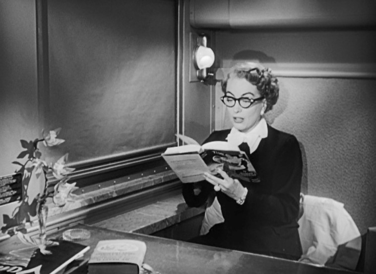 Myra catches up on her reading in a studio set, heavyweight Pullman compartment. As the train makes a stop, she raises the shade and looks outside. Holy Moley, is that Lester — the actor she canned a few weeks ago?