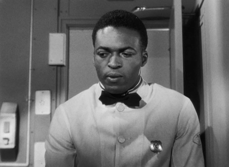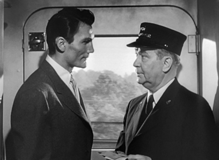 Saved by the Porter. Just to show there’s no hard feelings, Myra invites Les in for a drink. Good view of the porter’s uniform — which appears to have a “California Zephyr” patch on his left sleeve. I thought they were still on the New York Central.