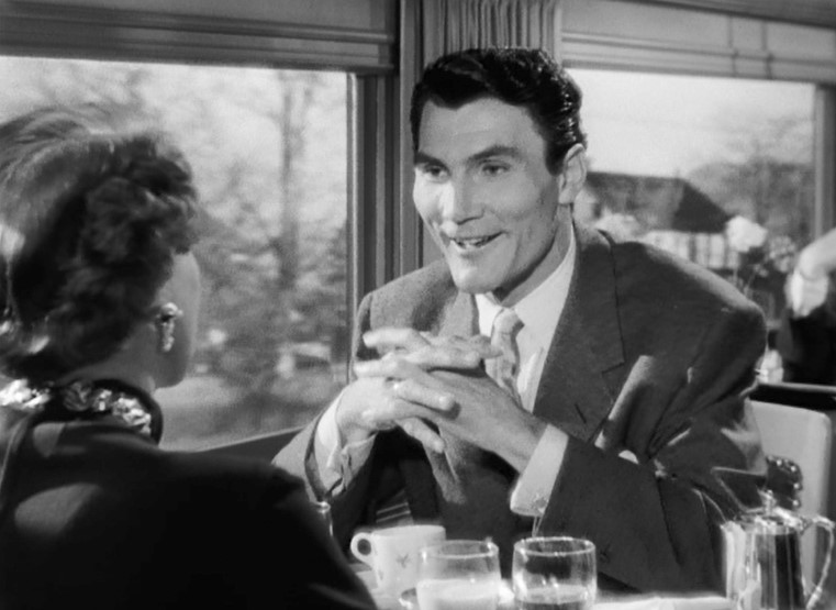 Comes the dawn, the unlikely couple are seated in the diner for a little breakfast. Check out all that railroad silver and glassware and china on the table. Oh, to travel like THAT once more…