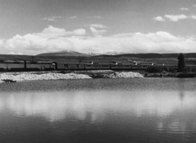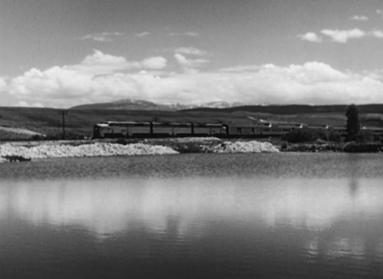 More Continuity shots. A trio of DRGW Alco PA diesel locomotives in A-B-A configuration glides the California Zephyr past a snow-lined lake somewhere in Colorado. Check those 4 dome coaches up front! This would be the second day out of Chicago after Train #17 had left Denver, climbed the Front Range and passed through the Moffat Tunnel.