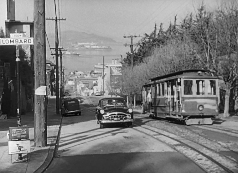 Our final “train” scene in the movie is a venerable San Francisco Cable Car (Hyde line) passing a 1952 Packard Patrician 400, which then turns down onto Lombard Street with famous Coit Tower in the distance.