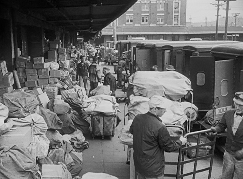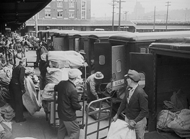 One of the first scenes in the film made me sit up and take notice. That’s Seattle with King Street Station in the background. Here we see trucks being loaded at the “Railway Terminal Post Office”. I checked an old blueprint I have, and railroad tracks ran right behind this building on the left, bringing mail over from the K.S.S. depot tracks (R.P.O., USPS Storage Mail, etc.).