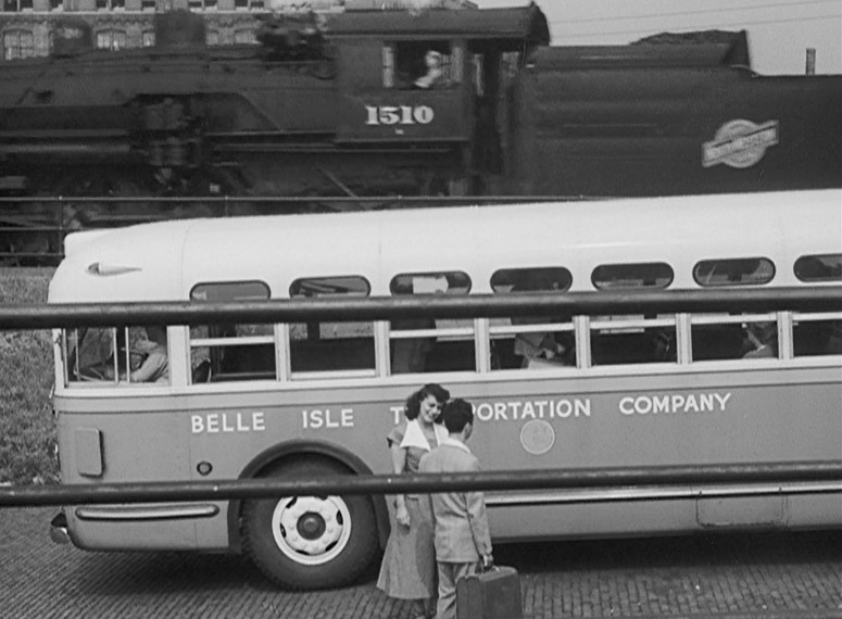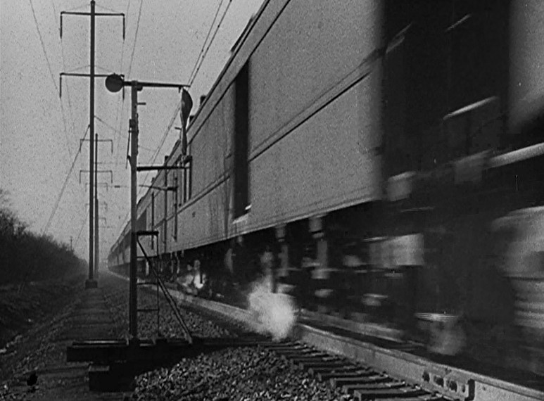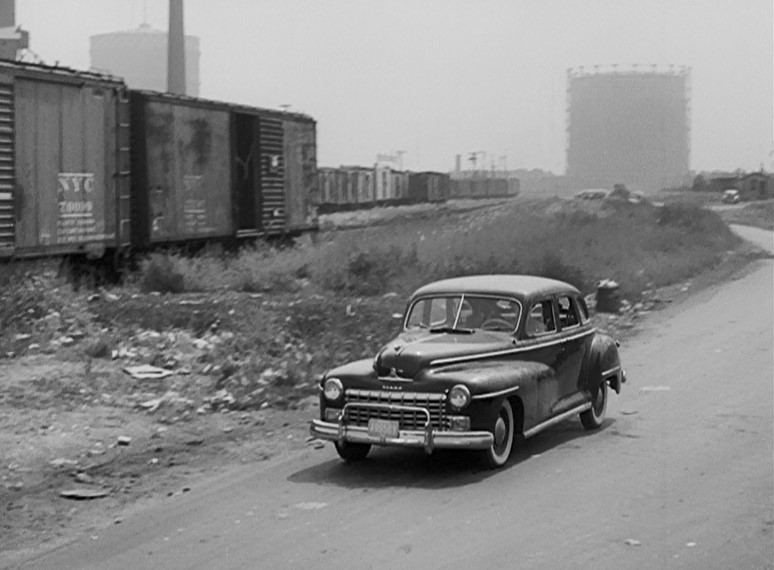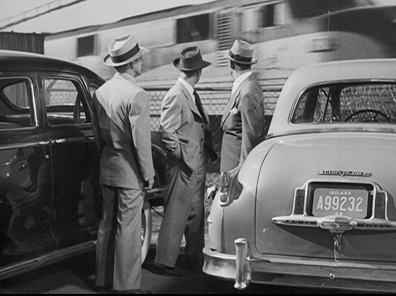 As the gangsters pull up in their 1949 Chrysler (Thanks again, big brother!), an Alco RS-something pulls a string of gondolas over the bridge. The gang watches the 1949 edition of the Pere Marquette passenger train (pulled by EMD E7A locomotives) pass via rear-screen projection.