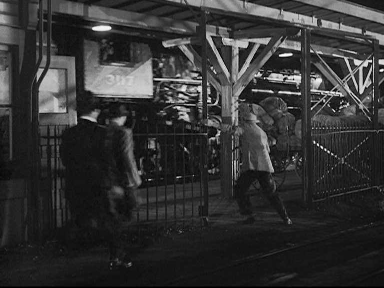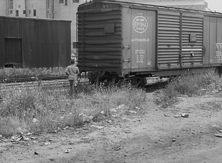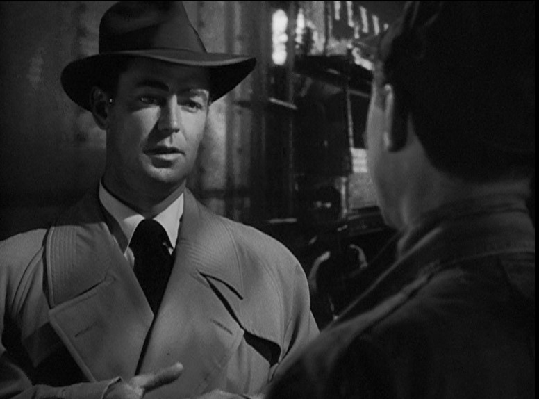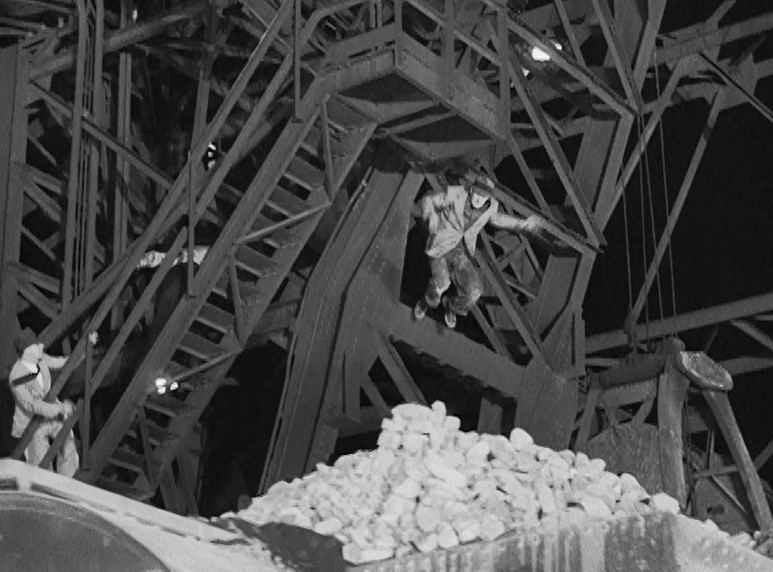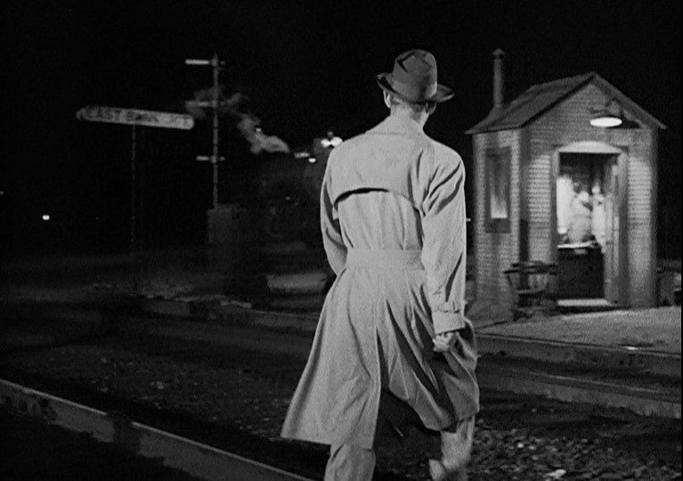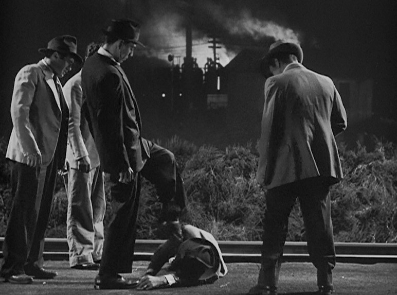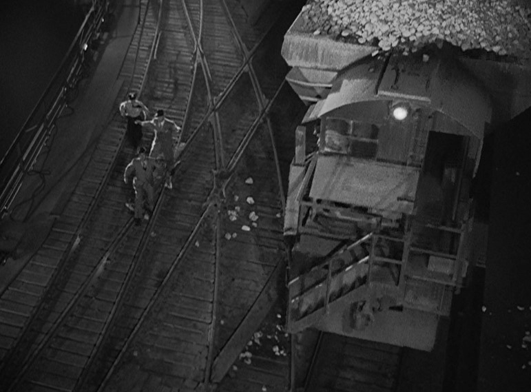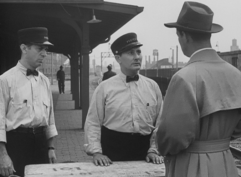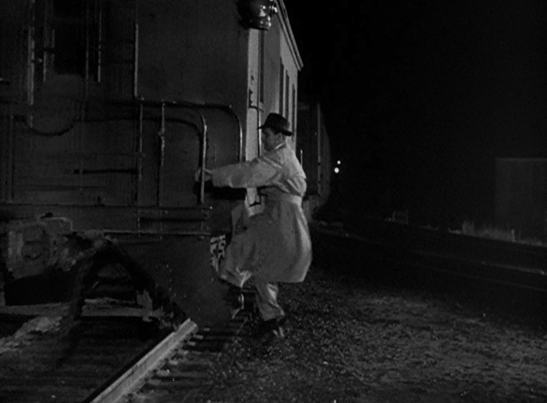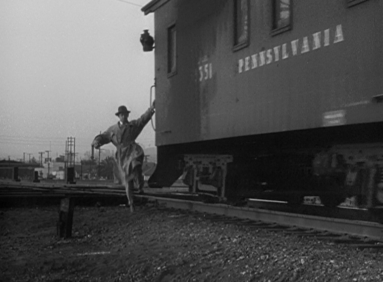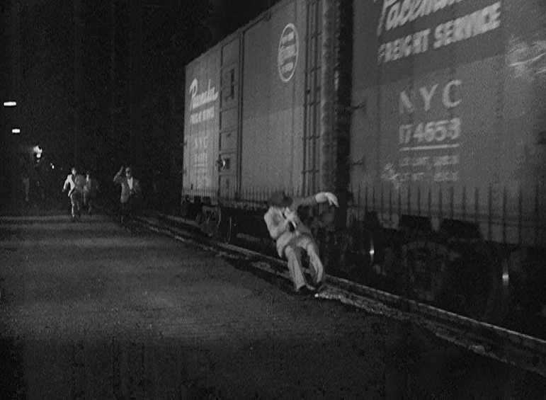 Ladd (or his stunt double) grabs onto a NYC “Pacemaker Freight Service” boxcar. Holding his tongue just right, Al dismounts as the gang races after him. (He’s trying to join/infiltrate them.) Joe Friday rolls him over as a steel mill glows moodily in the background.