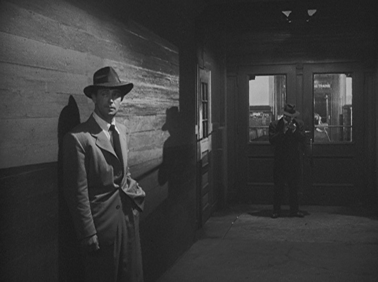 Many thanks to reader Mark Herrmann who tipped me off about this film noir goodie. After purchasing the DVD, I researched it and discovered train scenes filmed in Indiana AND Southern California. In addition to Alan Ladd (who plays the tough-as-nails Postal Inspector, Al Goddard), there are small parts played by Jack Webb (“My name’s Friday”) and Harry Morgan as two gang henchmen. That’s Al stepping off the caboose above.