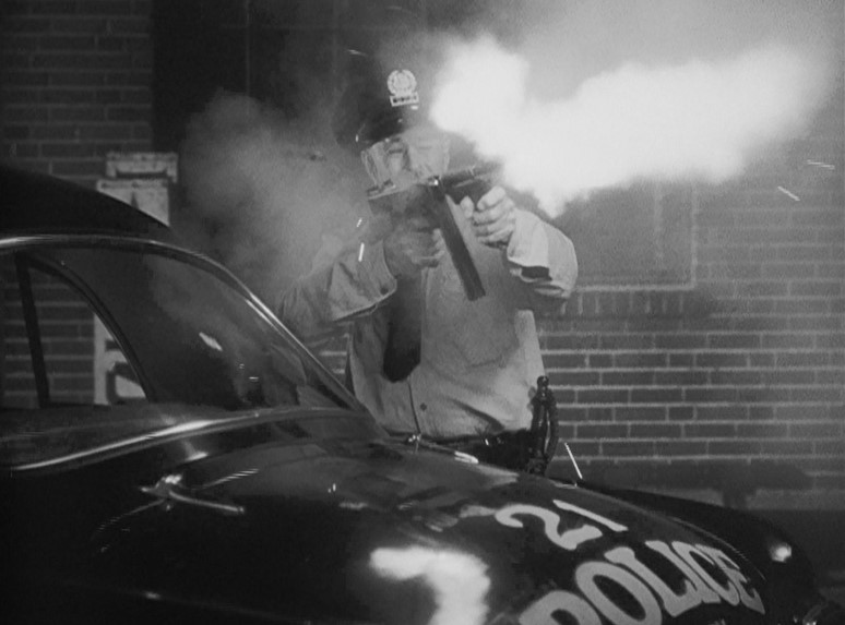 There are no more trains, but I can’t resist a couple frames of the big shoot out as the cops roll up to make the sting. Check out the officer, eyes closed, blasting away on his Tommy Gun as shells fly everywhere. Sic Semper Gangsters!