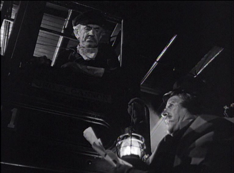 As the camera looks down the locomotive’s boiler, Mr. Conductor discusses their orders with the Engineer in the time-honored manner.
