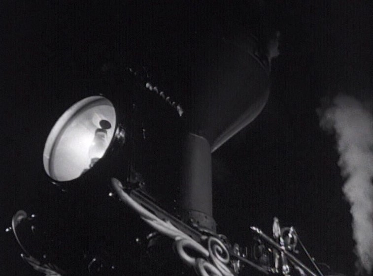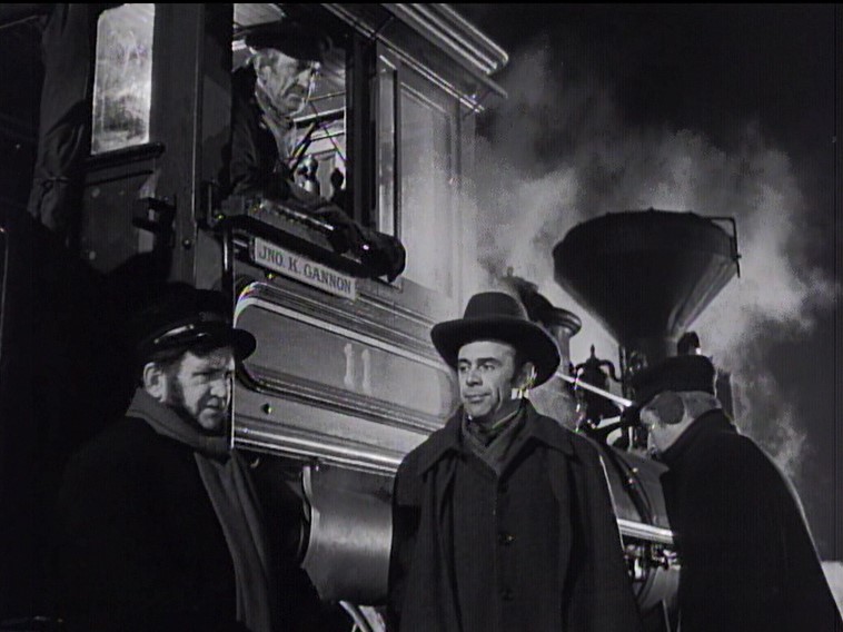 It was a dark and stormy night. Wreathed in steam is the wood-burning, 1872 product of the Baldwin Locomotive Works; Coming down the aisle is our hero, Sergeant John Kennedy (played by Dick Powell). Hey, that gal with the knitting on the left…that’s none other than June Cleaver (played by Barbara Billingsley)! I wonder if she spoke jive back then…