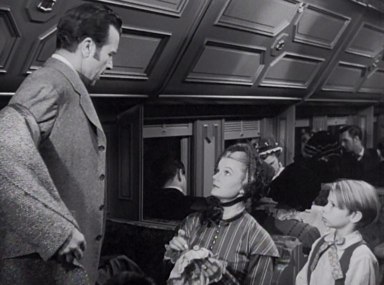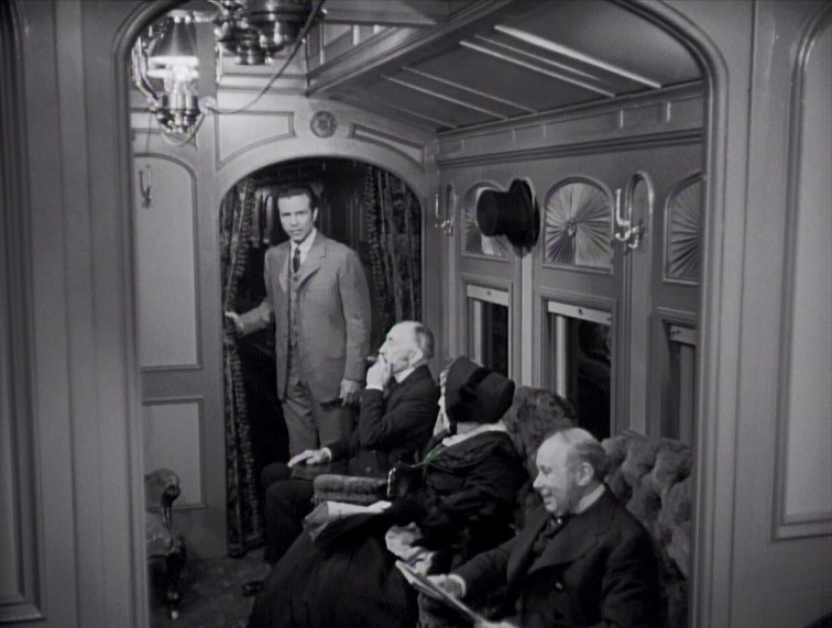 Sgt. John questions June and son. He’s looking for his contact who has his train ticket. As he makes his way forward, we see a parlor section of one coach. Finally, he reaches the baggage car.