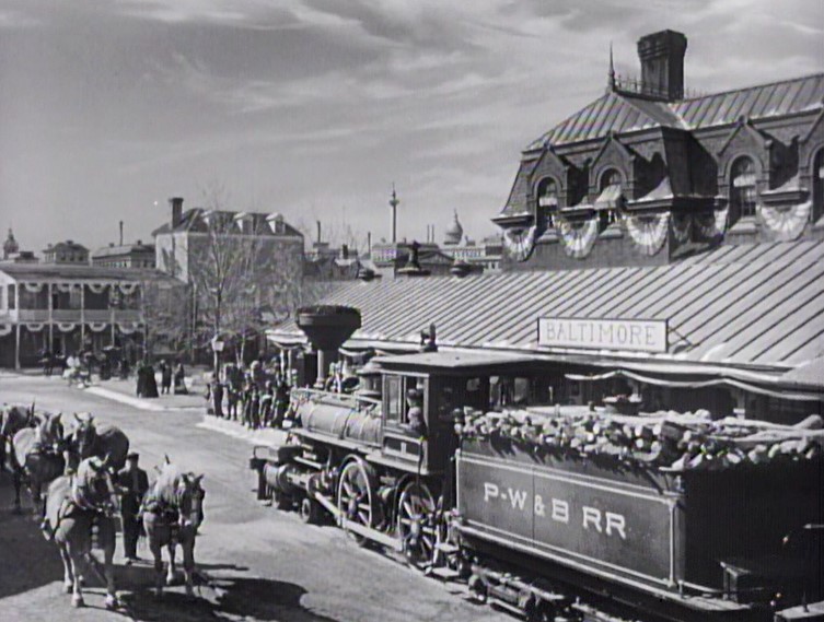 Much better. The Reno trundles into Baltimore station. Due to a local ordinance (steam engines not allowed on city streets), the train and Reno are separately pulled by a team of horses to another depot — much to Engineer Gannon’s displeasure.