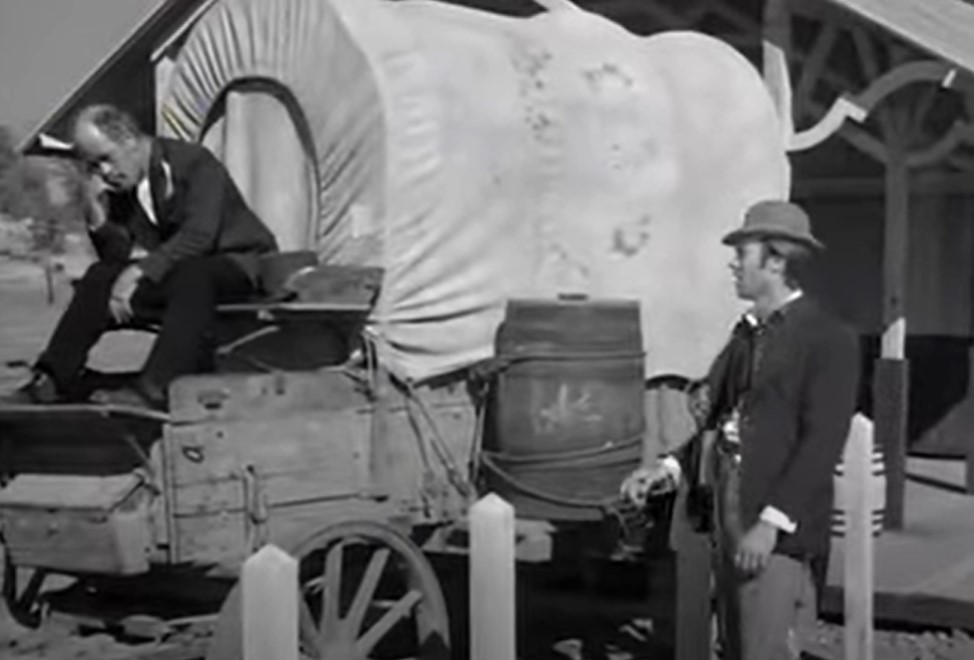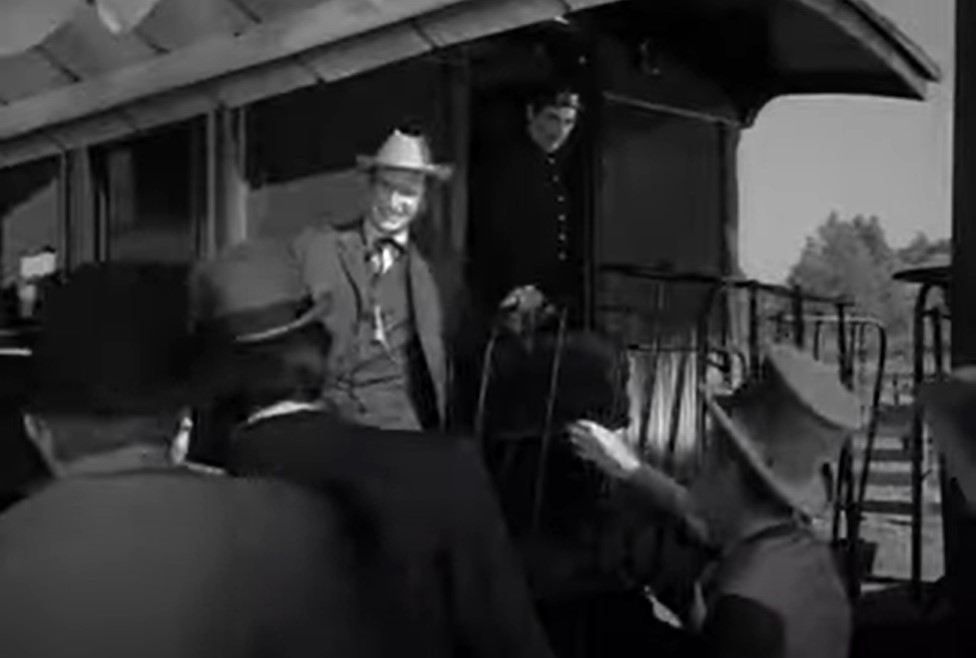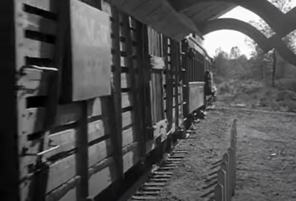 “Chicken Feather Siding?” O-kay. Standing in for “the middle of Missouri” is the Sierra Railroad location of Quinn. Rowdy is nervously stomping along trackside (check those spurs!) waiting for the train bearing their trail boss, Gil Favor.