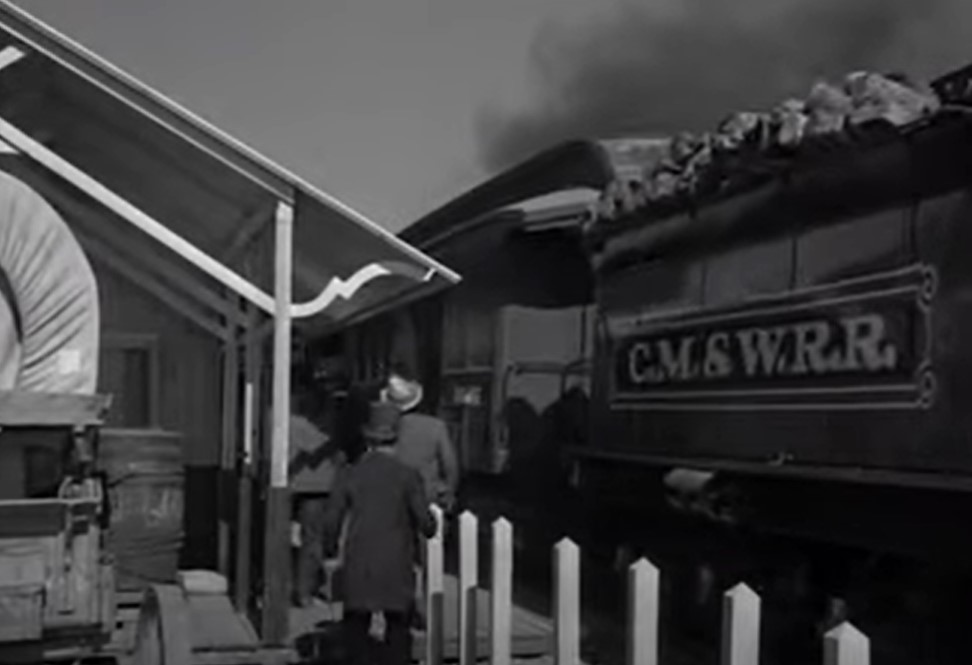 Puffing into the station is Sierra #3. Note the entire train is lettered, “C.M. & W. RR”. This honors the show’s creator-producer Charles Marquis Warren.