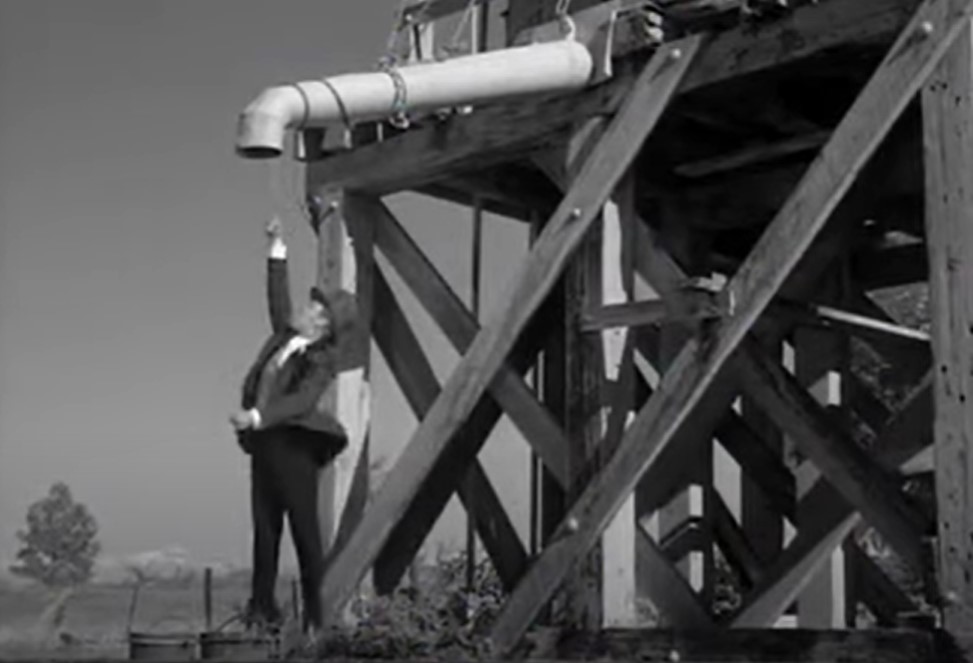Time for some comic relief! Wishbone needs a couple pails of water. Foolishly, he stands directly underneath the railroad water tower spout and winds up getting a tremendous dousing. This ends the railroad scenes at the 16:30 minute mark.