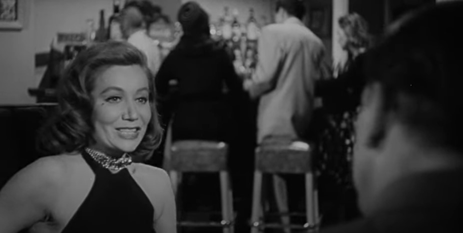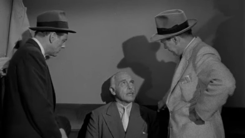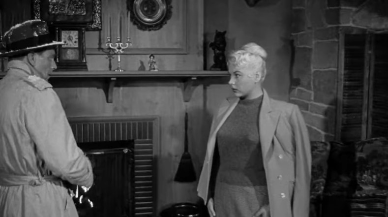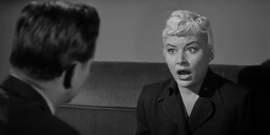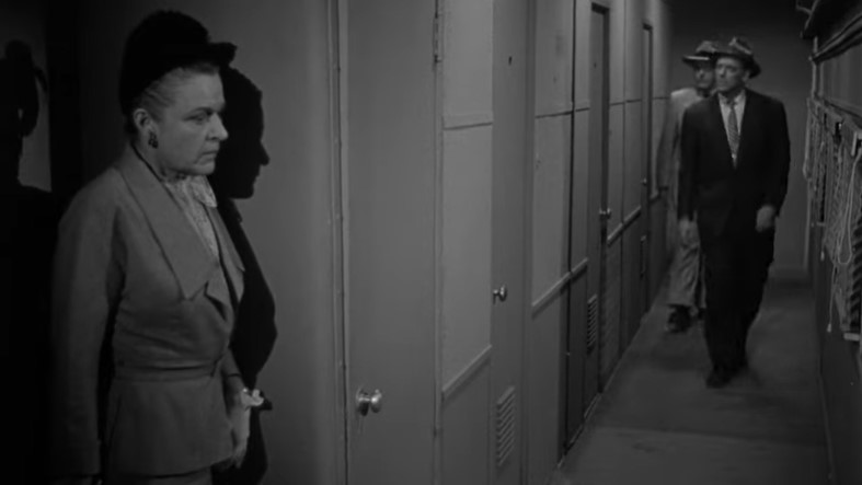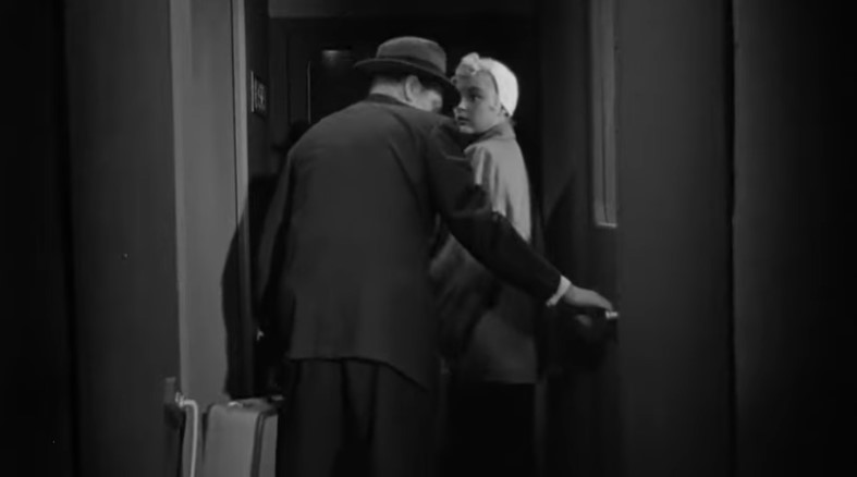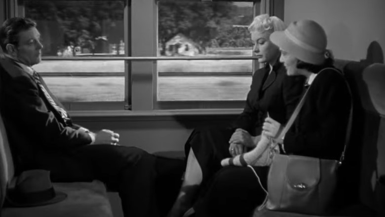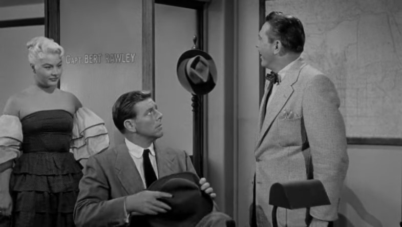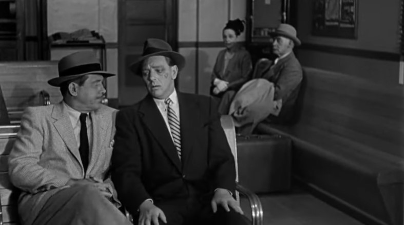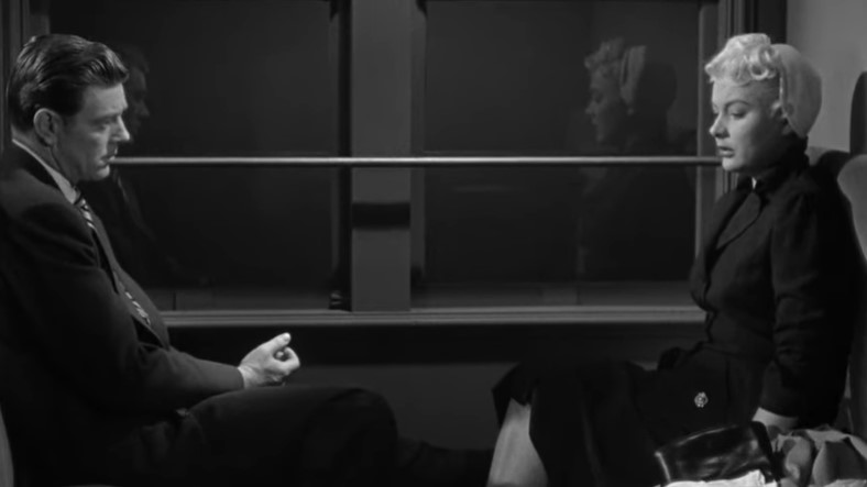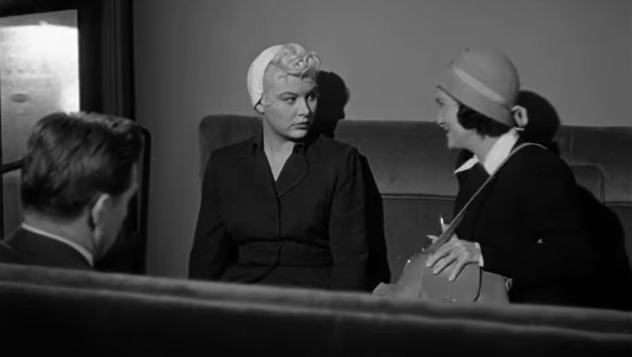 Lounge singer Eden Lane (played by Barbara Payton) is being taken to the hoosegow by Detective Ray Patrick (played by Paul Langton) and police matron Mrs. Thomas (played by Madge Cleveland). This is our first “onboard” scene with rear screen projection. Note the rather spartan quarters in this obvious studio mockup of a Pullman compartment.