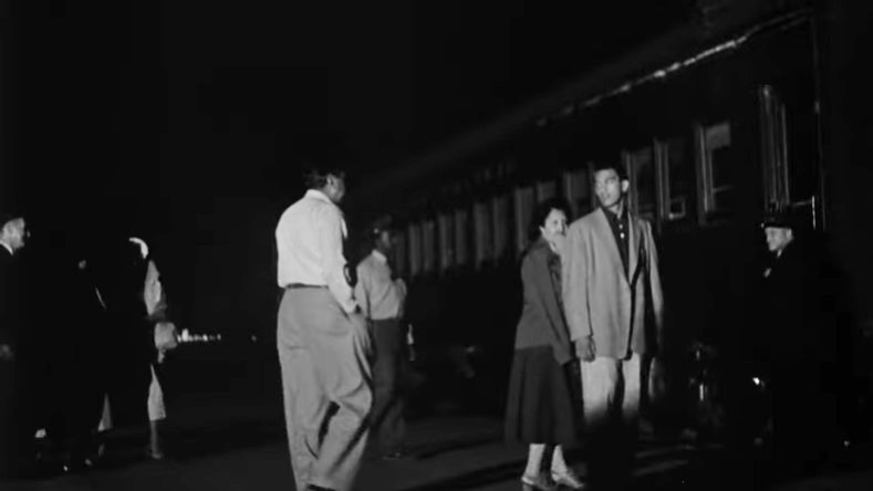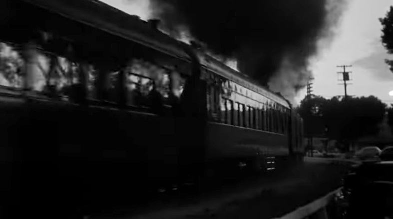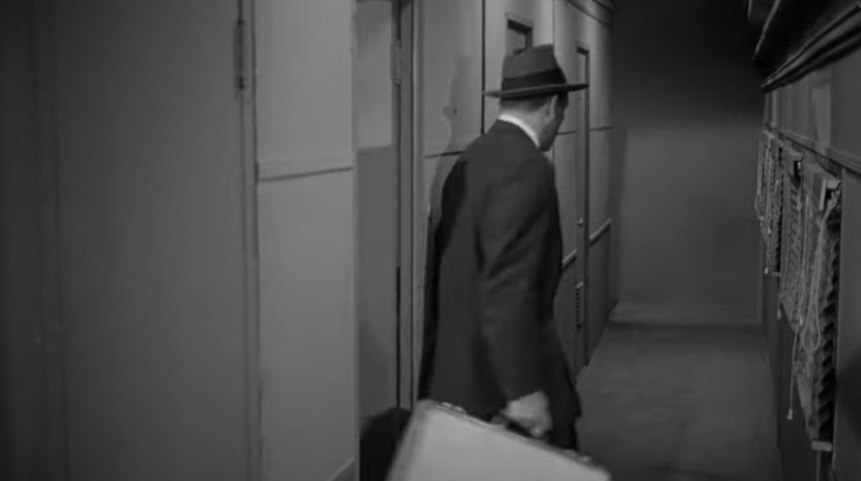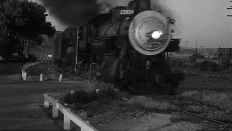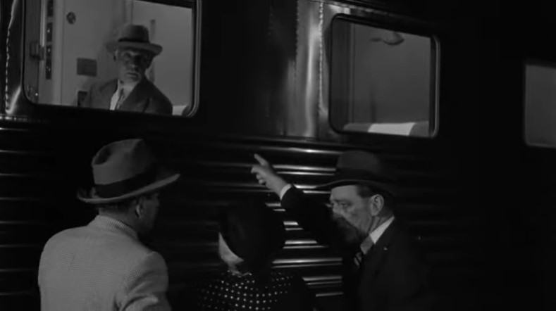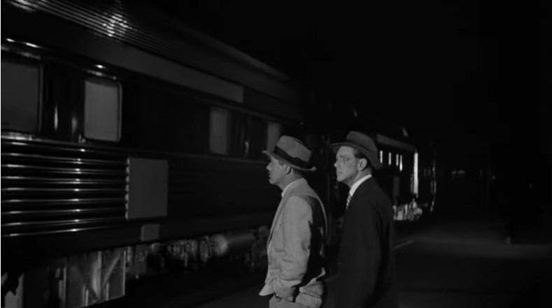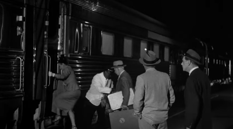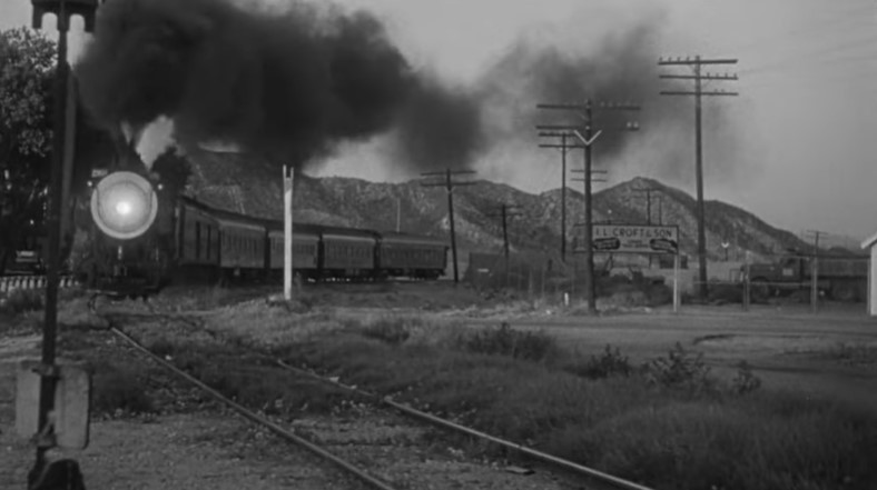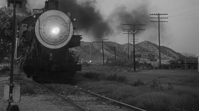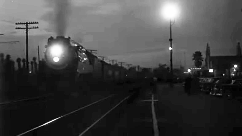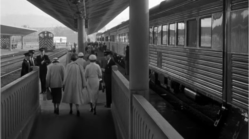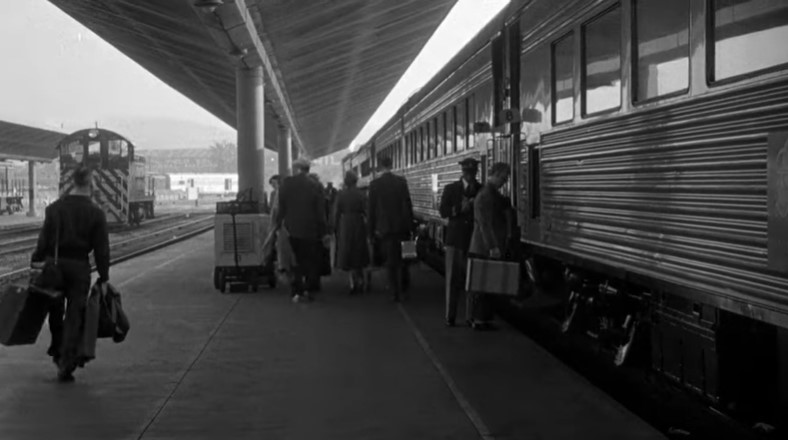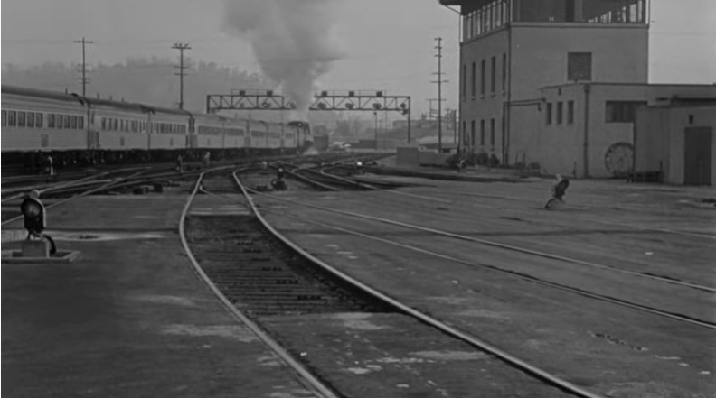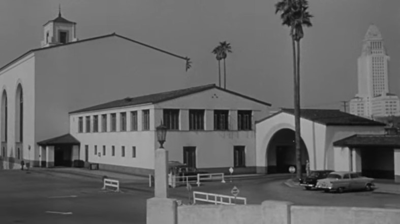 With Los Angeles City Hall (Dah-da-Dump-da…) looming in the background, we get an unusual back view of Los Angeles Union Passenger Terminal. Filmmakers used stock footage of passengers loading an L.A. to San Francisco “Daylight” train. Note the two tiger-striped EMD switchers on adjacent depot tracks.