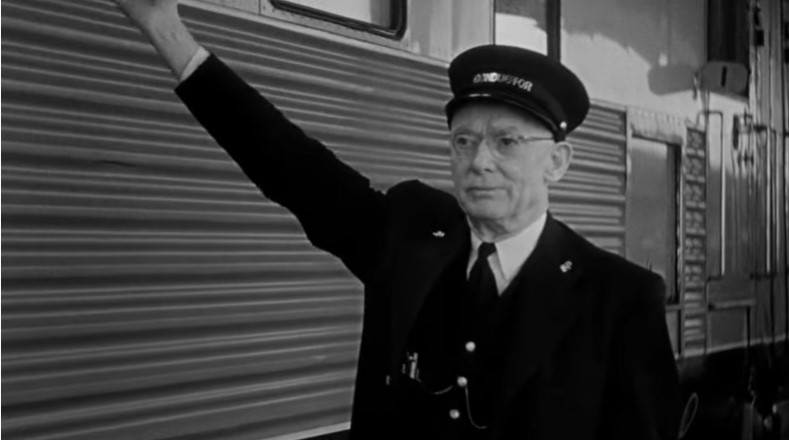 The big finish, finds Ray and his boss (played by Robert Shayne) tailing the elderly couple seated behind them in a depot waiting room. As the train arrives, it is led by SP #4458, a GS-5 class “war baby” 4-8-4, which entered service in 1942.