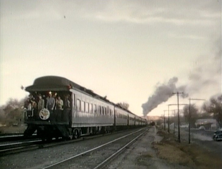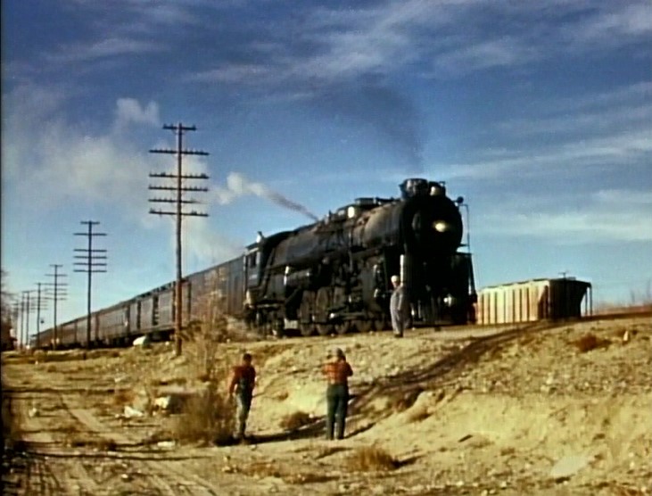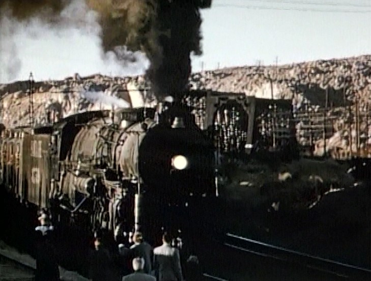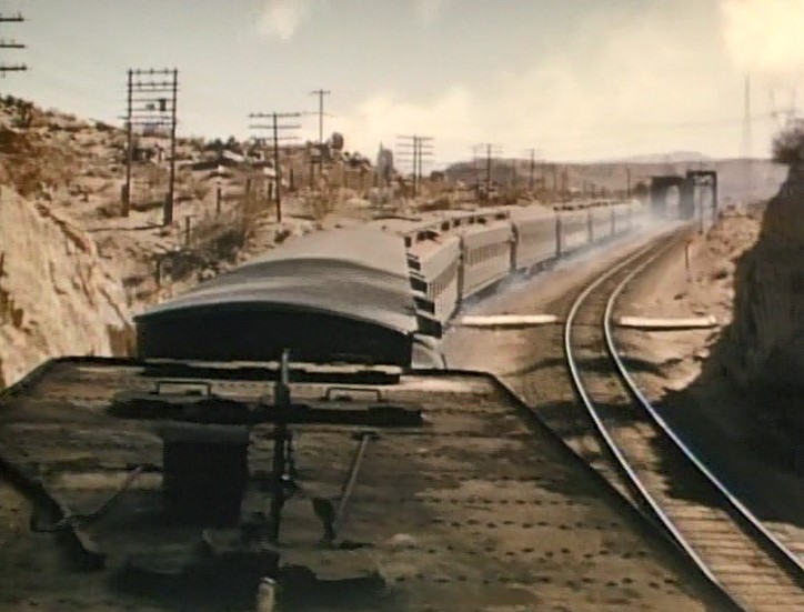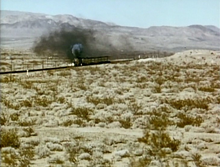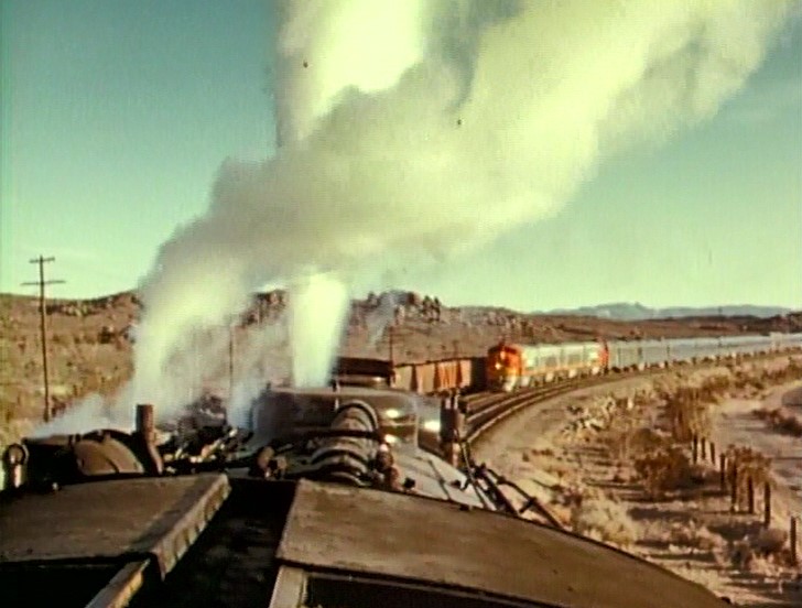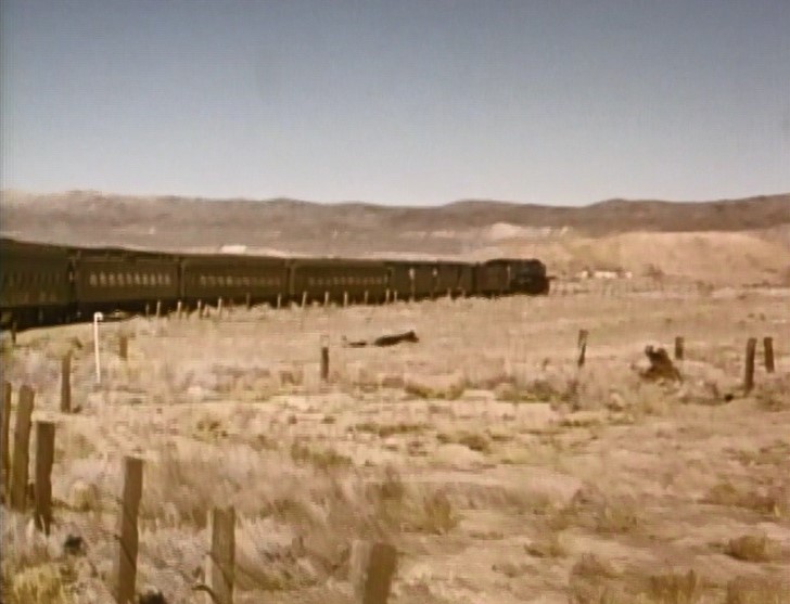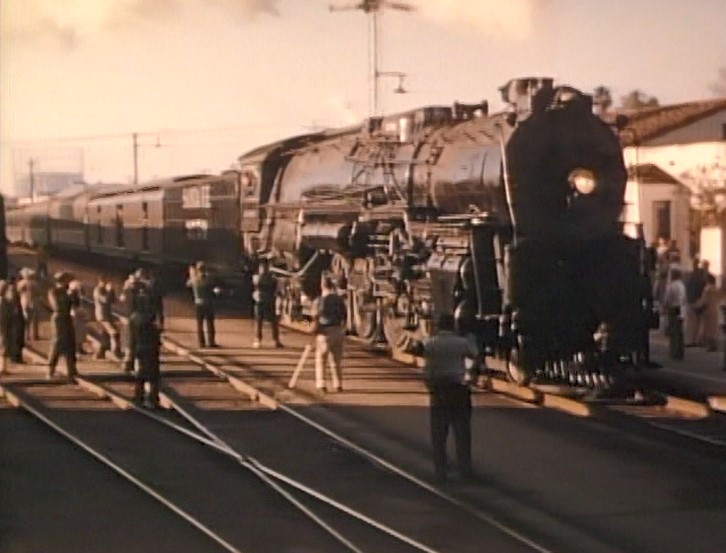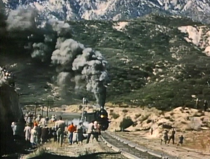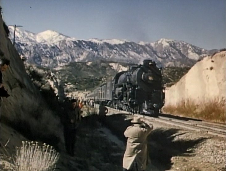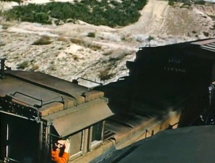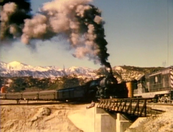 Climbing the Cajon Pass grade, we see the railfan responsible for all the treacherous “top-of-the-tender” footage. One “J. Allen Hawkins” was just crazy enough to risk life and limb for posterity. The Pentrex DVD is dedicated to him.