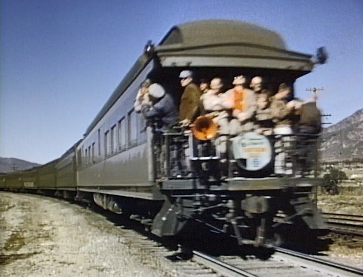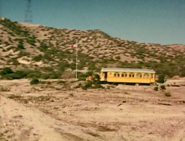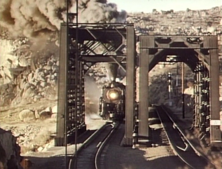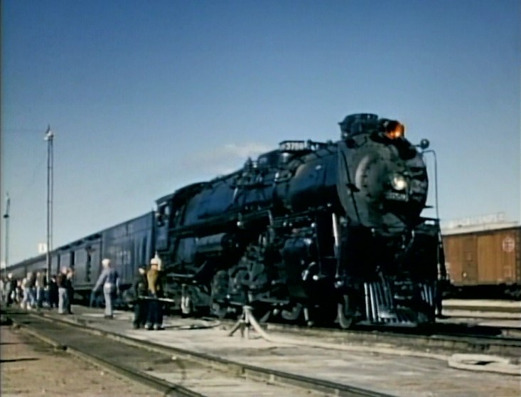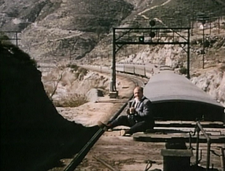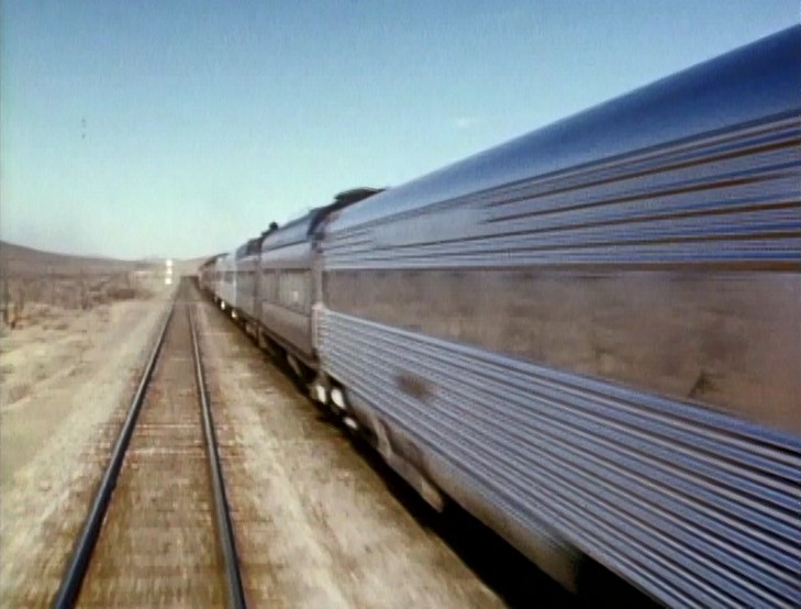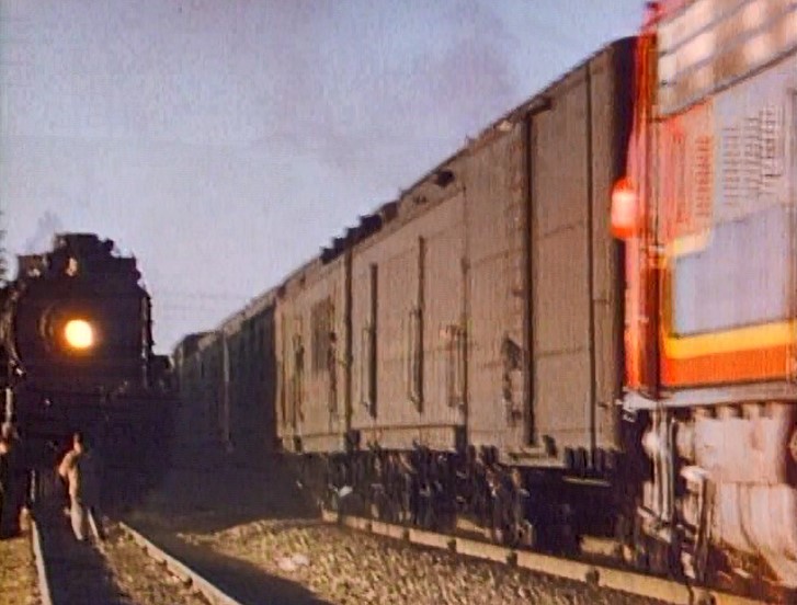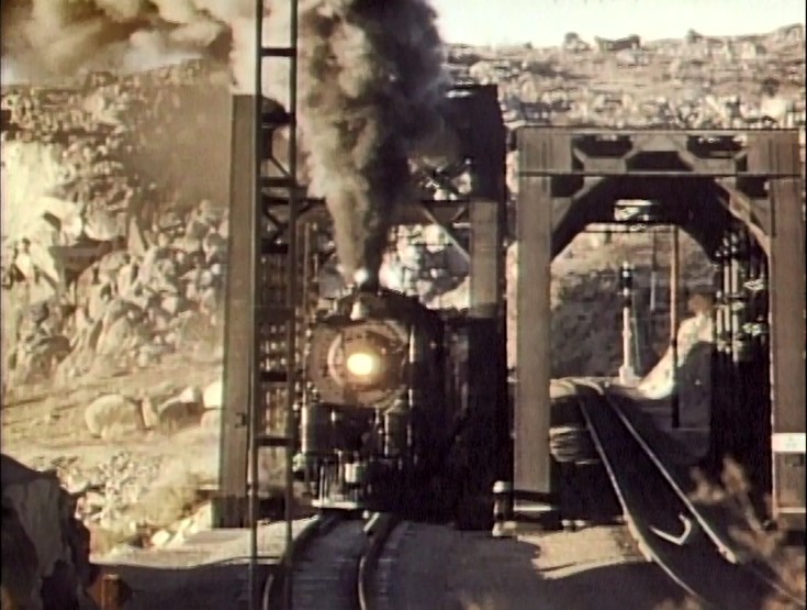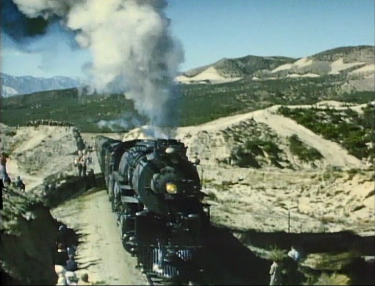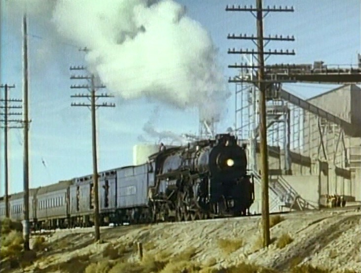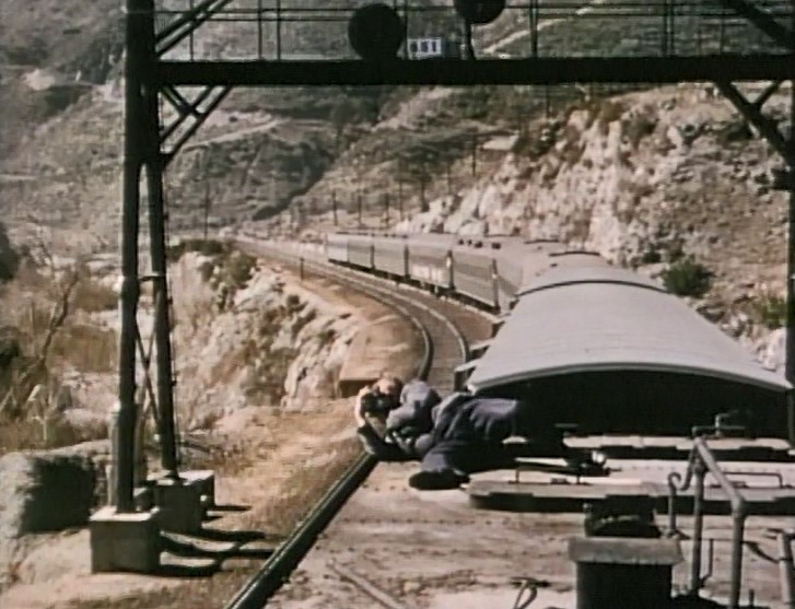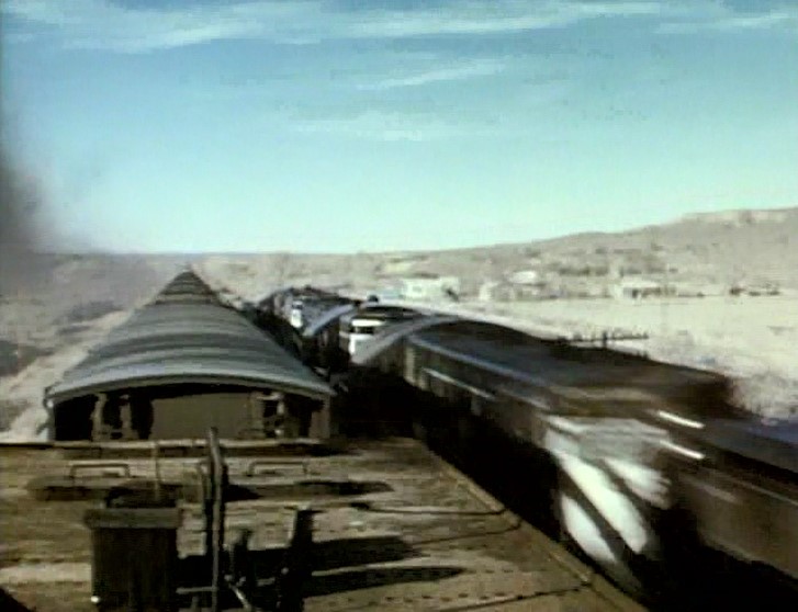 Climbing the Cajon Pass grade, we see the railfan responsible for all the treacherous “top-of-the-tender” footage. One “J. Allen Hawkins” was just crazy enough to risk life and limb for posterity. The Pentrex DVD is dedicated to him.