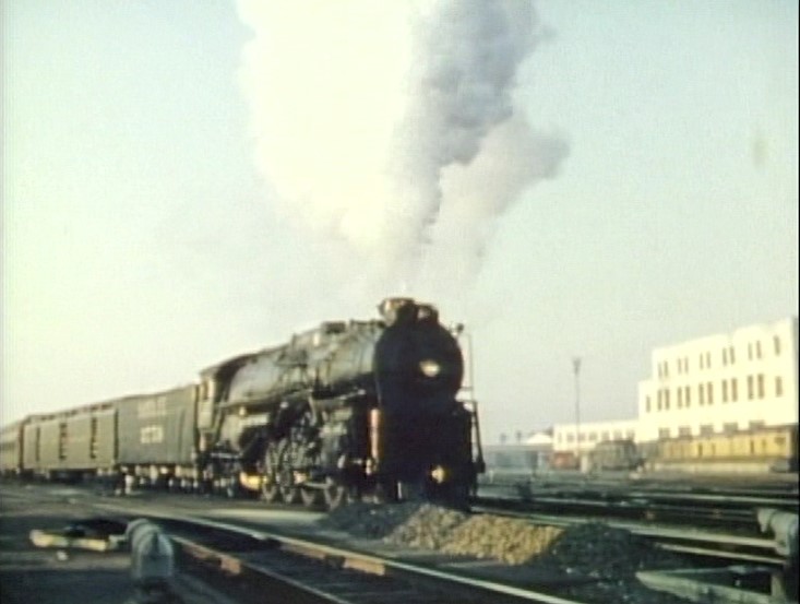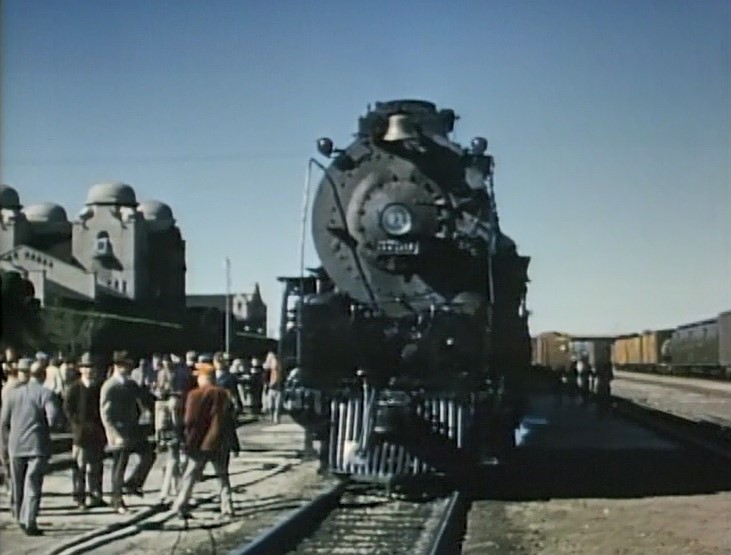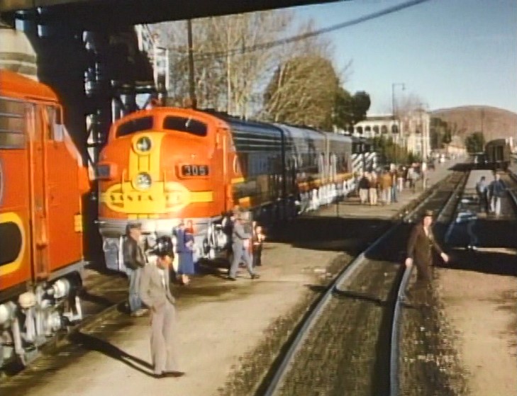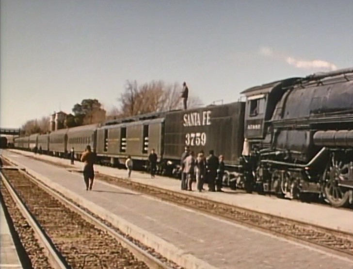 At San Bernardino, AT&SF #3759 cuts off the train and runs light to take on more water. Cool San Berdoo depot alongside 3759 — which as of 2022 is still in use! Pulling out of town with an impressive string of cars following.