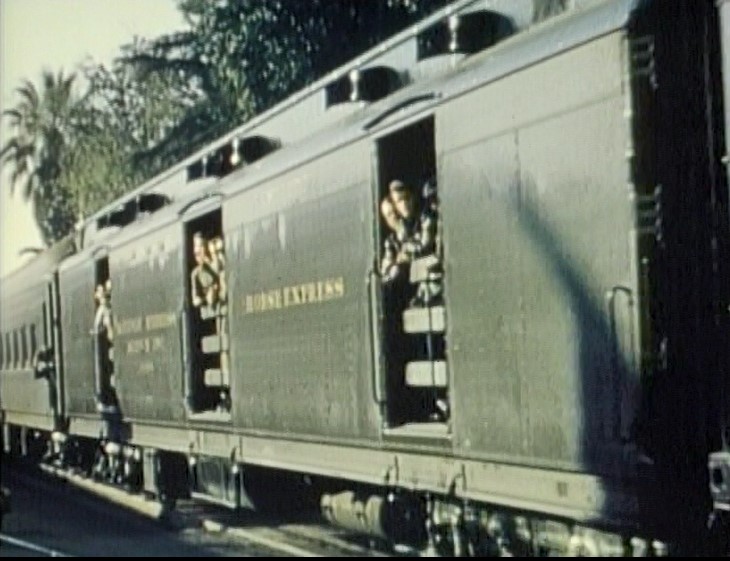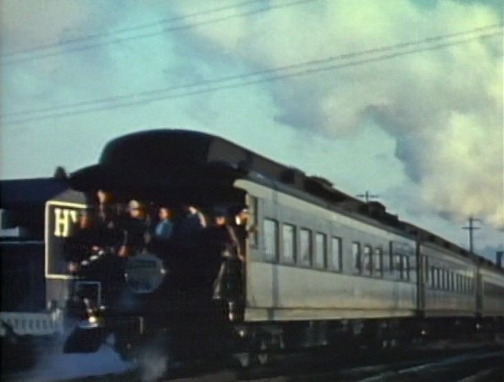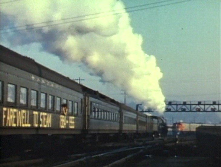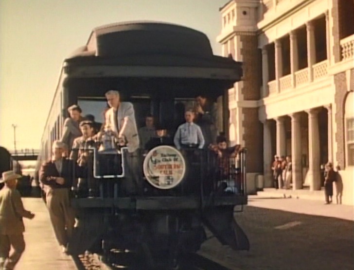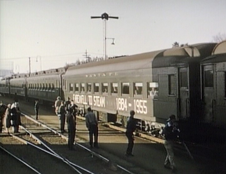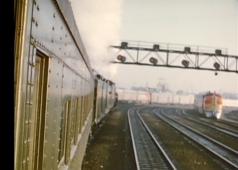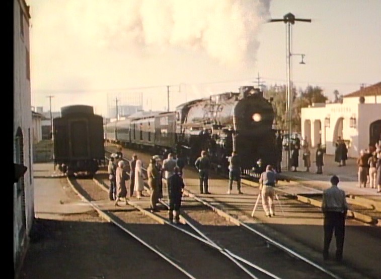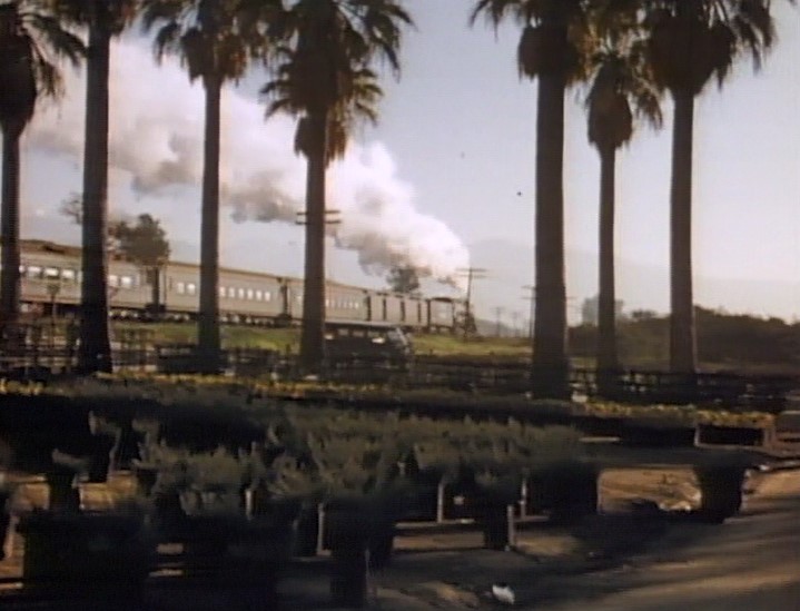 Our first clear view of the train is just after pulling out of LAUPT. One of the coaches is labeled, “FAREWELL TO STEAM 1884 – 1955”. There’s a full crowd on the rear platform of AT&SF cafe-observation car #1509. The special passes the inbound El Capitan train #21.