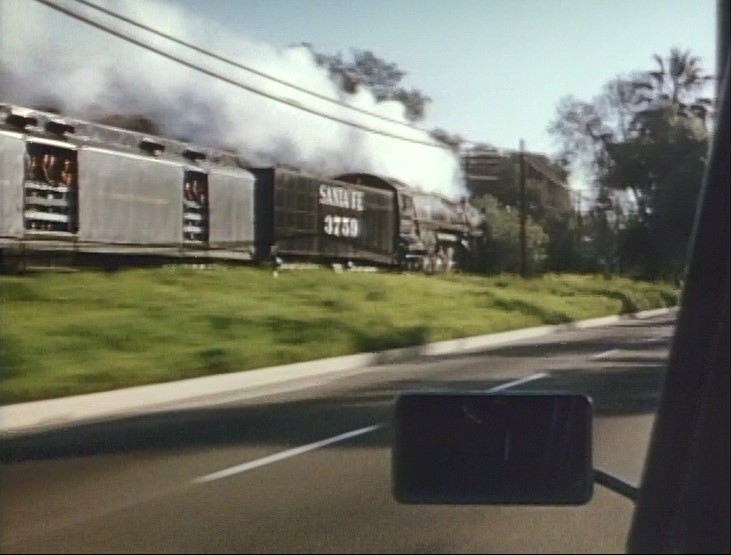 On the flats east of San Bernardino, there’s quite a caravan of cars pacing 3759. At Devore, it’s standing room only on the rear of ATSF #1509. How about that bell!