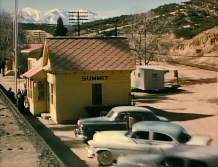 At Summit depot, check out those boonie cars! From the station, early 1950’s Plymouth; 1953-54 Oldsmobile; 52-53 Studebaker. THANKS MARK! The other curiosity at Summit in 1955 was the electric railway car “Descanso” moved uphill from the station and used by visiting railfans as an overnight cabin. The car has a um, rather morbid past, so check out the above link.