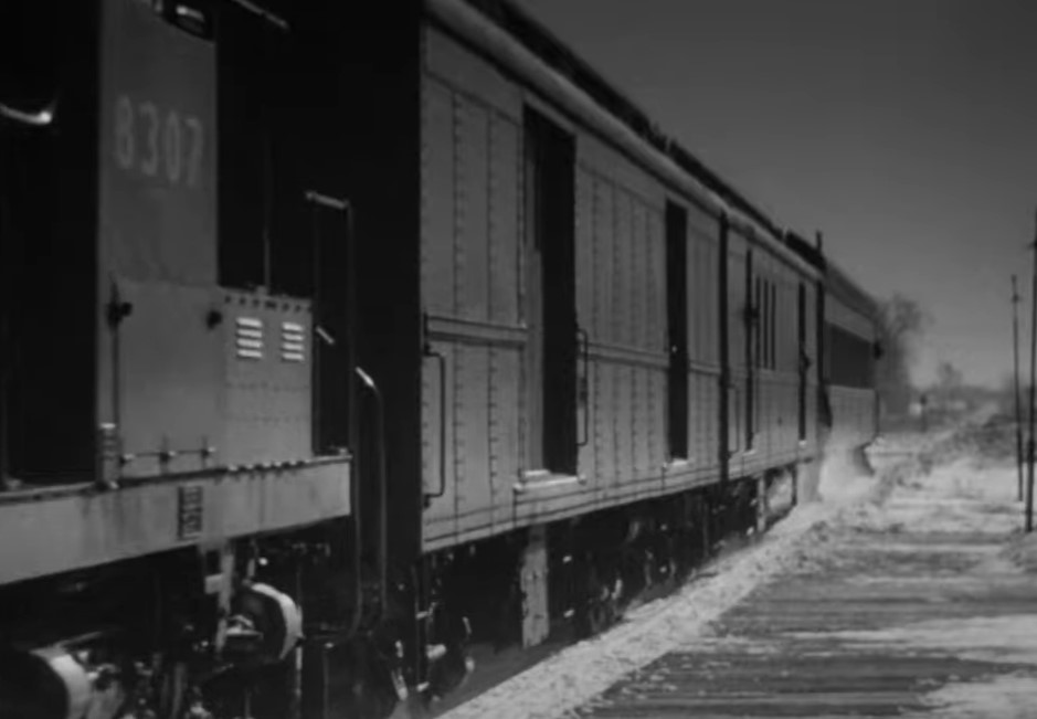 As the credits open, a steam-powered freight blasts through town, with the camera panning over towards the tower and station. Too dark (early morning) for an ID on the locomotive.