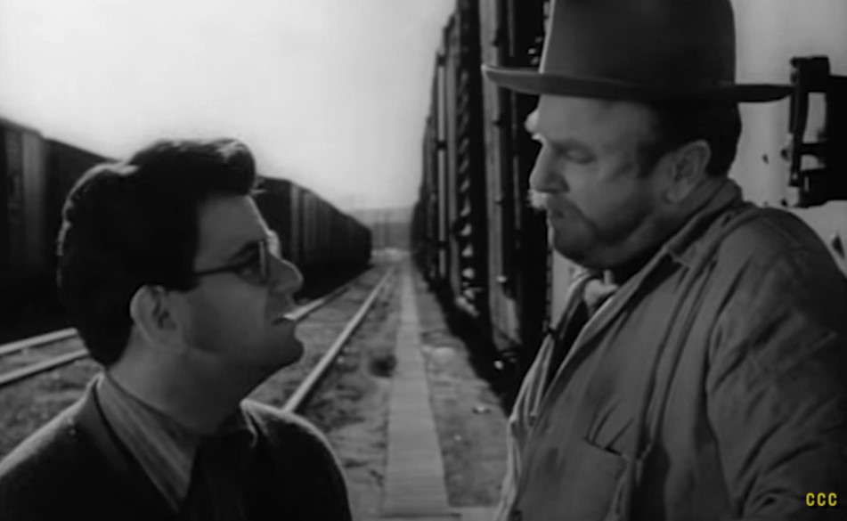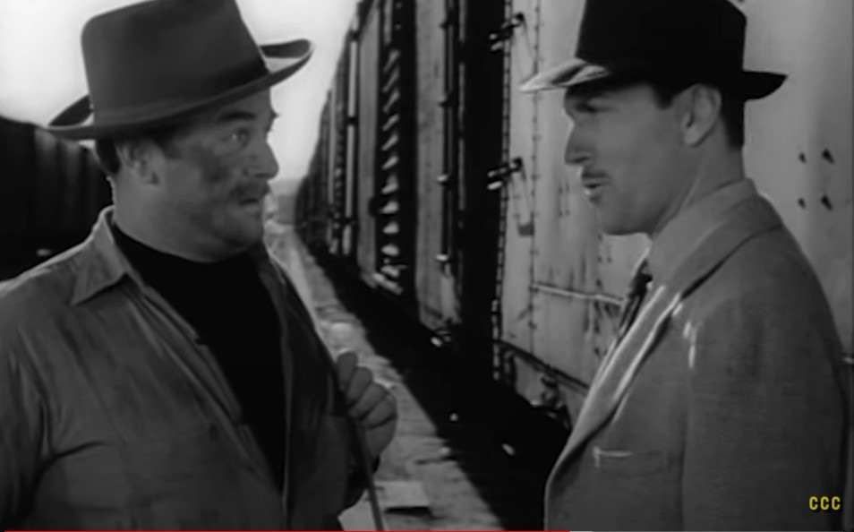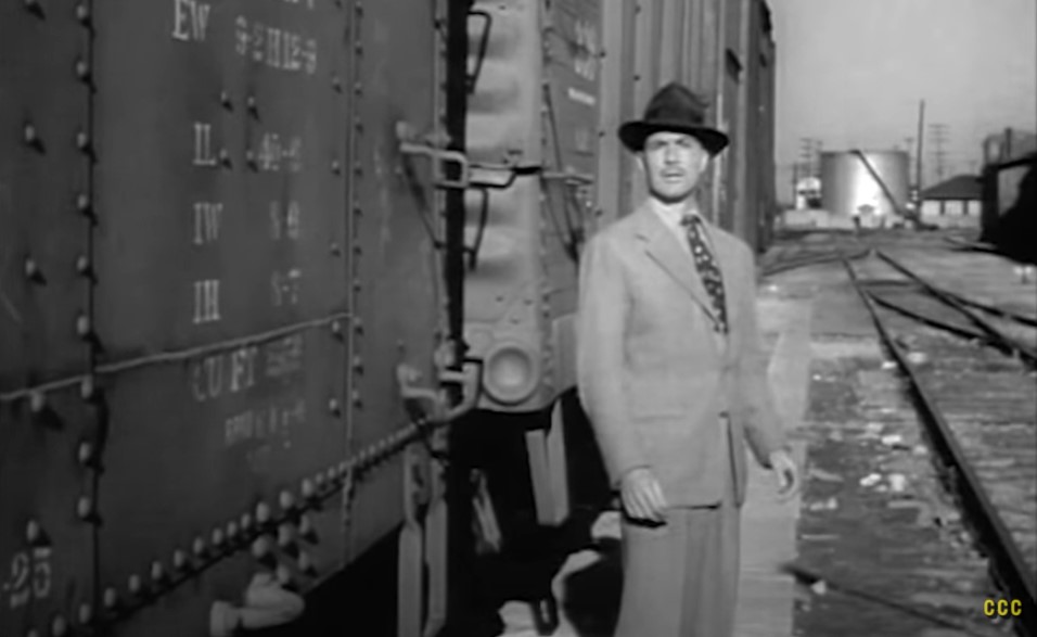 Meanwhile down at the train yard, Agent Rod and his sidekick Elmer (played by Sid Melton) are looking through box cars. All they find is a smelly old hobo — not the gunsel they wanted.