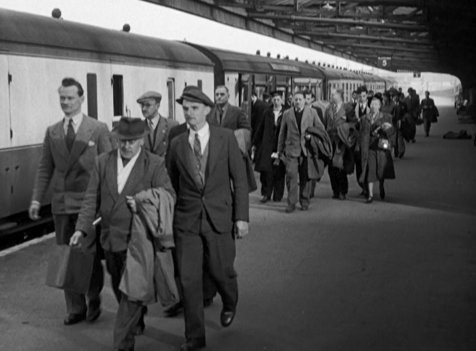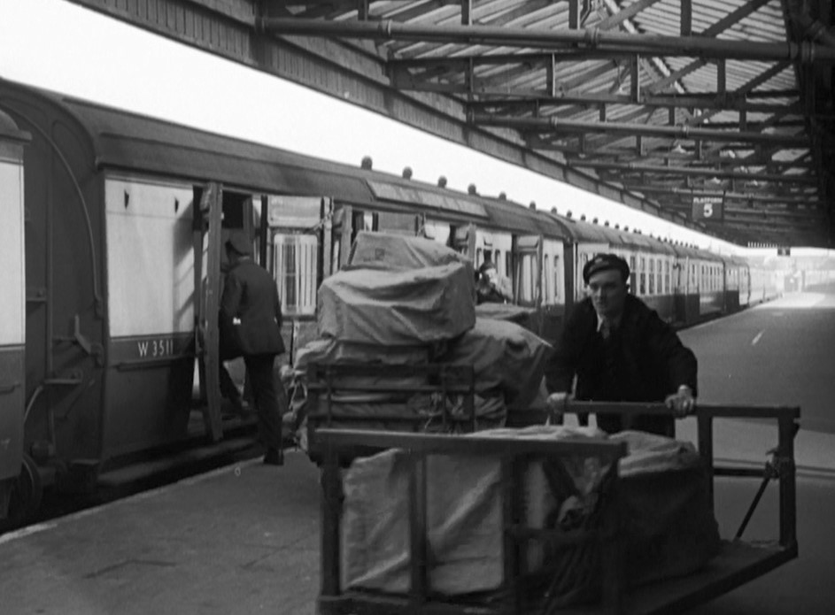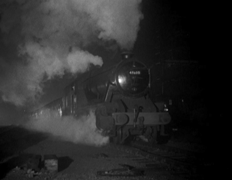 A class 8f 2-8-0 steam locomotive #48600 is racing through the night. Passing through Birmingham, a shadowy figure emerges from under the tarps. It’s The Saboteur! (played by Victor Maddern) who tumbles off the train after suspiciously monkeying around with the lading.