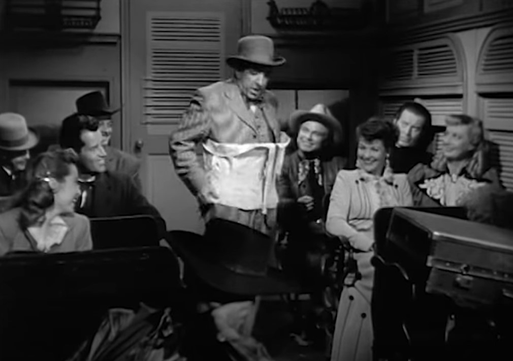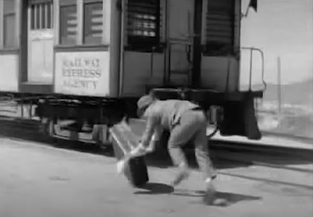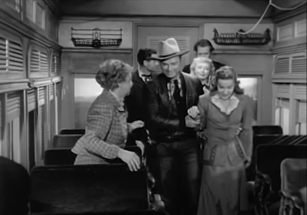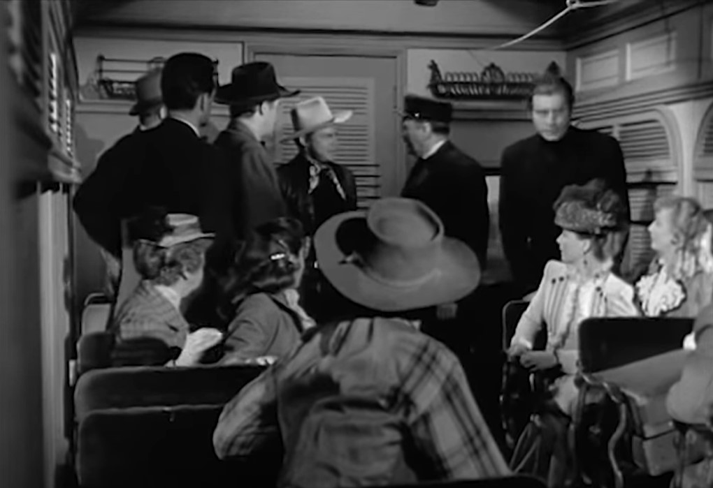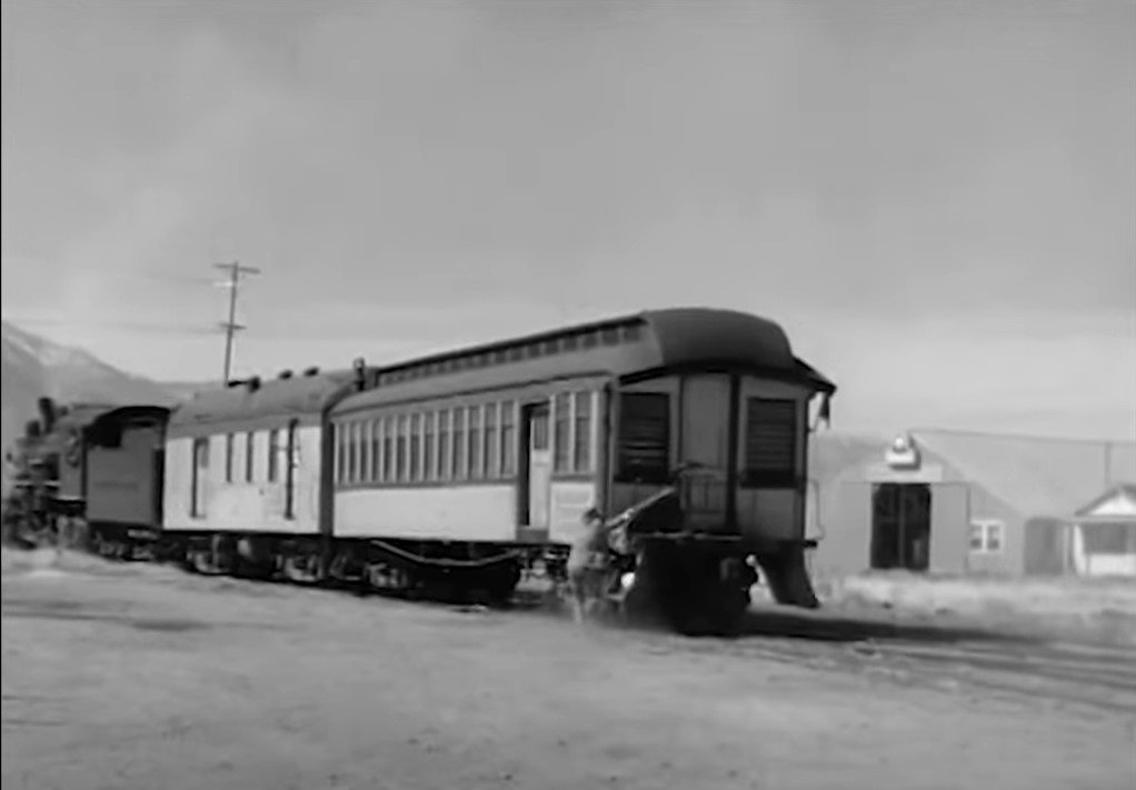 It’s train time at the Albuquerque Depot (location probably Minden, NV). The conductor talks it over with the engineer about their run to Tombstone. The drummer checks out the invalid chick and her aunt as two chorus girls watch with amusement. Meanwhile, the doctor (left) chats it up with the parson and aunt/niece combo.