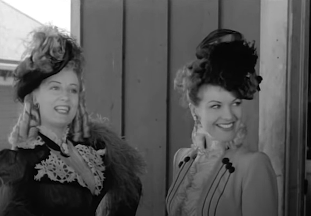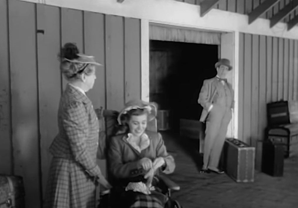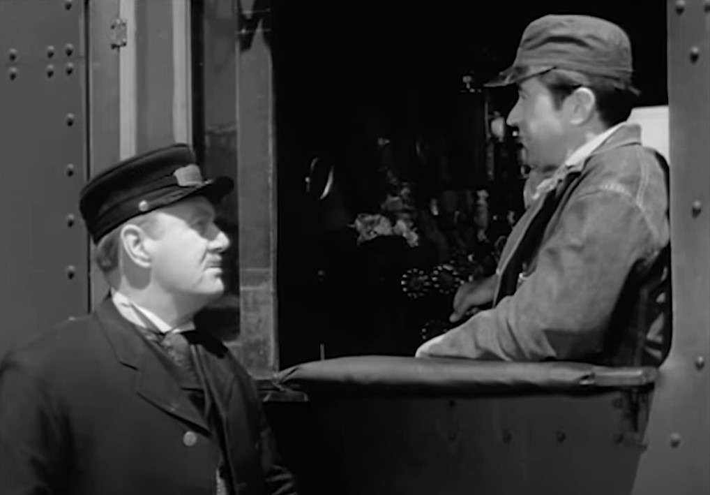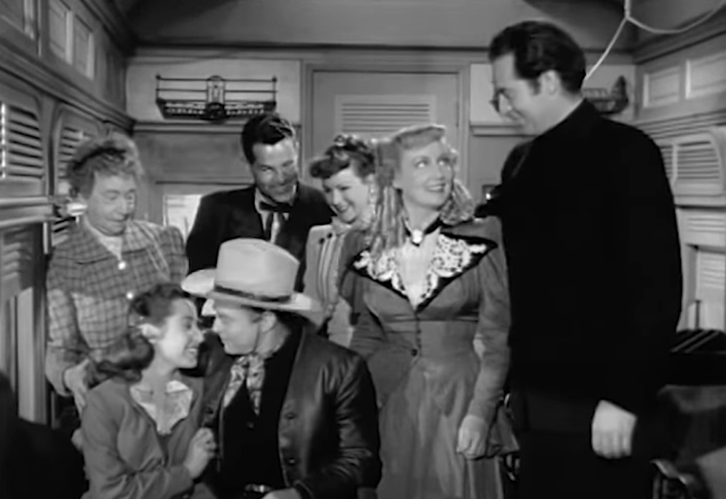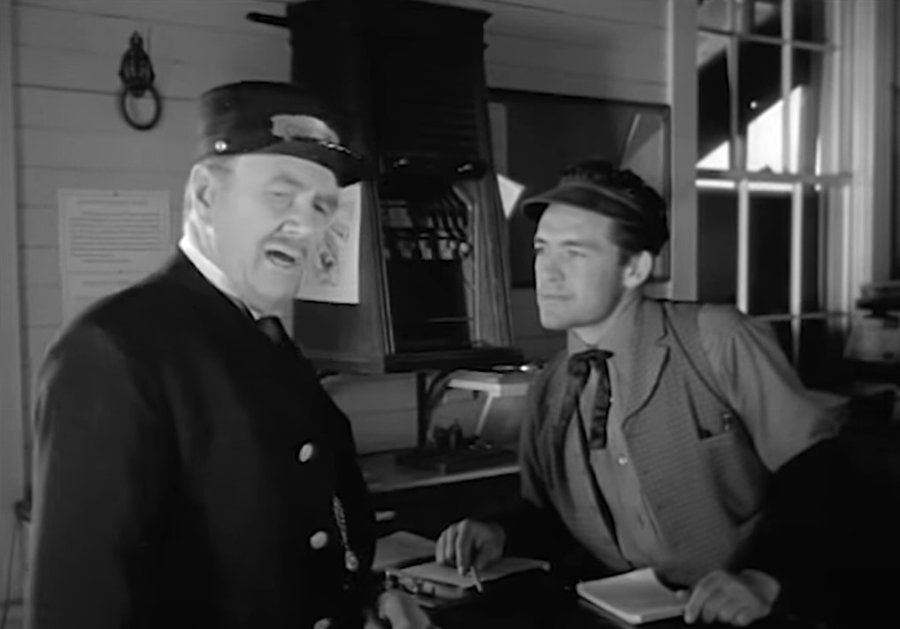 It’s train time at the Albuquerque Depot (location probably Minden, NV). The conductor talks it over with the engineer about their run to Tombstone. The drummer checks out the invalid chick and her aunt as two chorus girls watch with amusement. Meanwhile, the doctor (left) chats it up with the parson and aunt/niece combo.