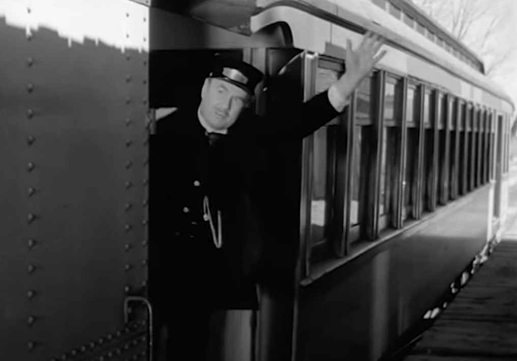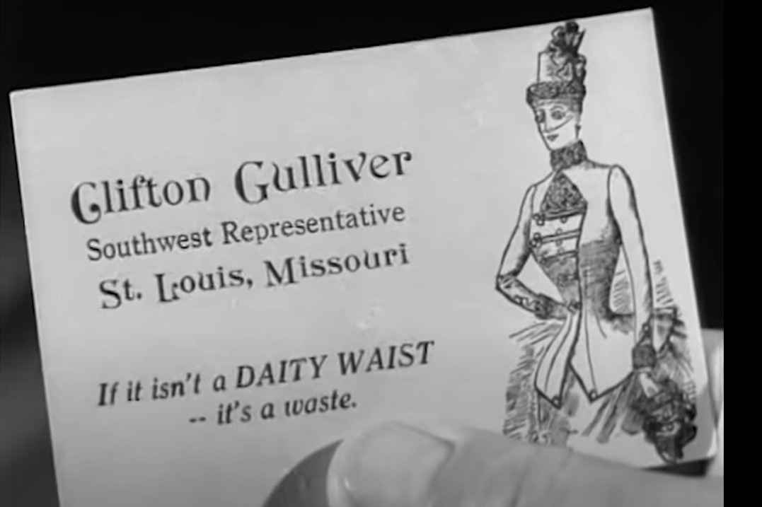 Meanwhile on board, the corset salesman is prancing up and down the aisle hawking his wares to everyone’s amusement. Auntie has retired to the back platform where the Conductor suggests she lay off the sauce for a while.